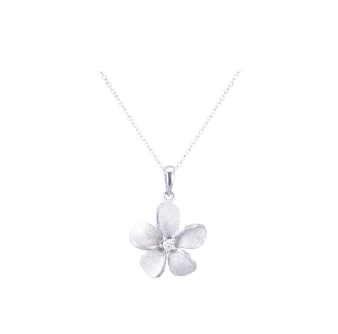 This is a 14k gold plumeria pendant by Denny Wong. It features one 0.03 carats diamond with a sand blast finish.