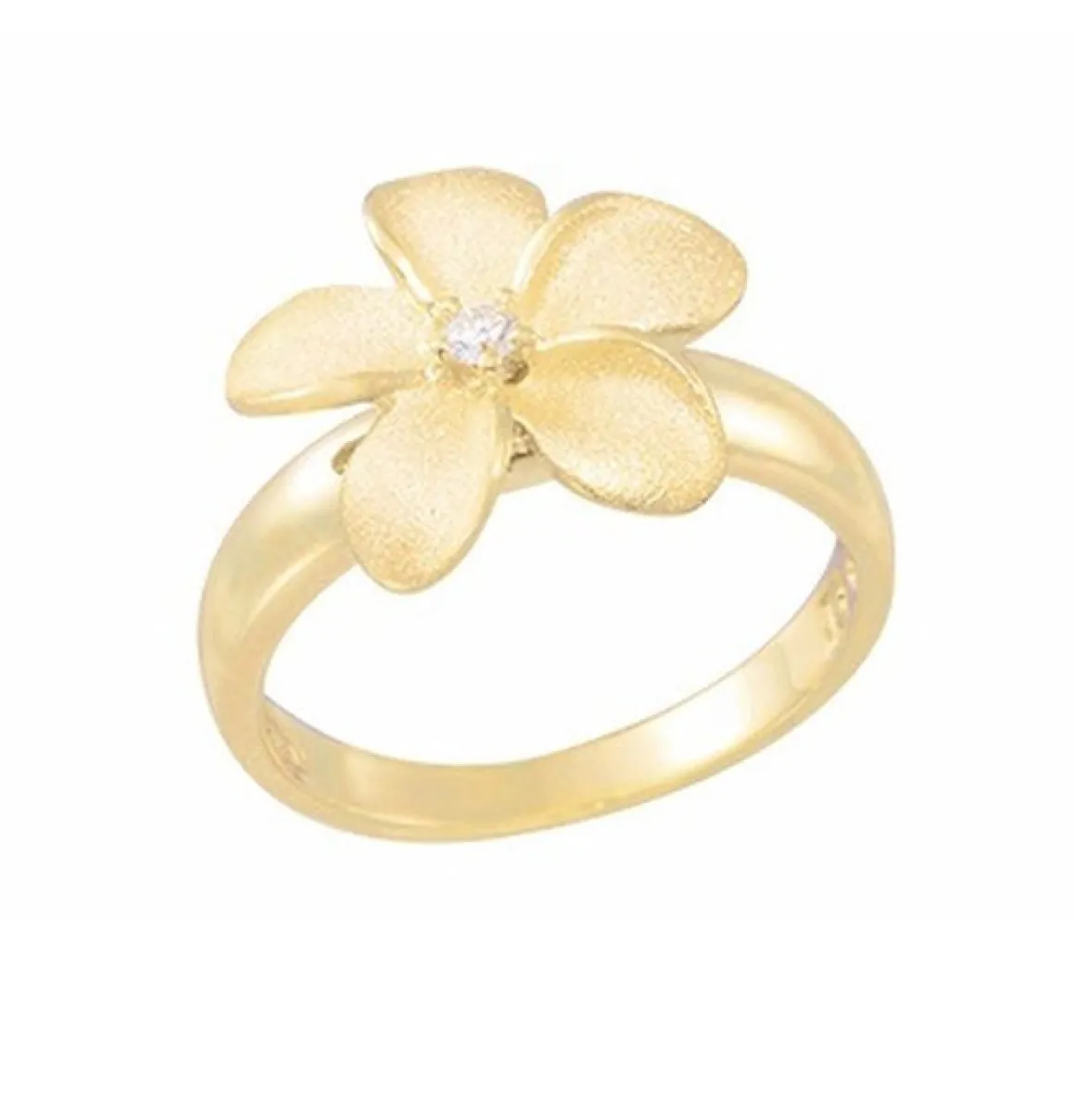 The plumeria collection by Denny Wong was created with the goal to capture the beautiful memory of Hawaii’s beautiful flowers. This ring features a 15mm sandblasted 14K gold and one 0.04 carat diamond.