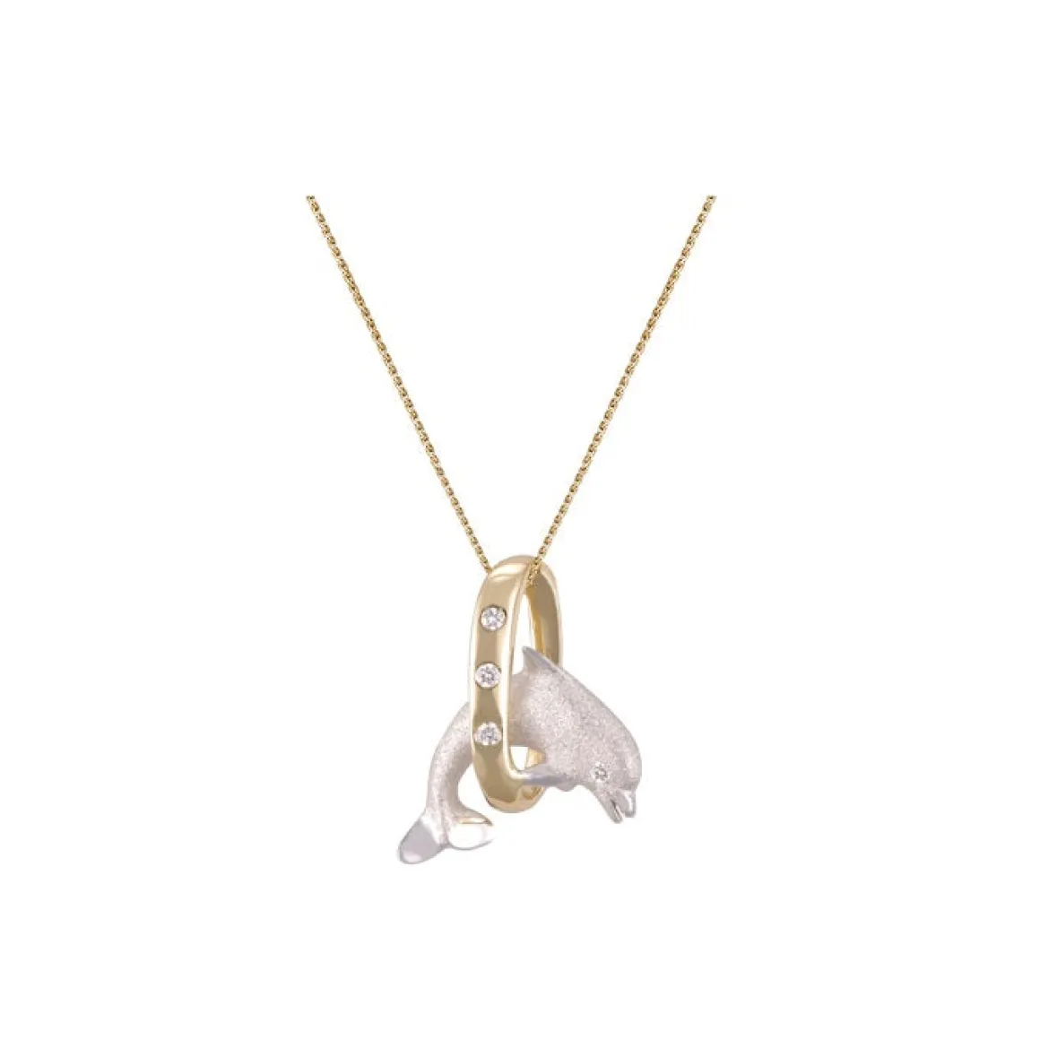 This is a14k 15mmgold pendantfinely handcrafted by Denny Wong.It features a single dolphin jumping in a loop.