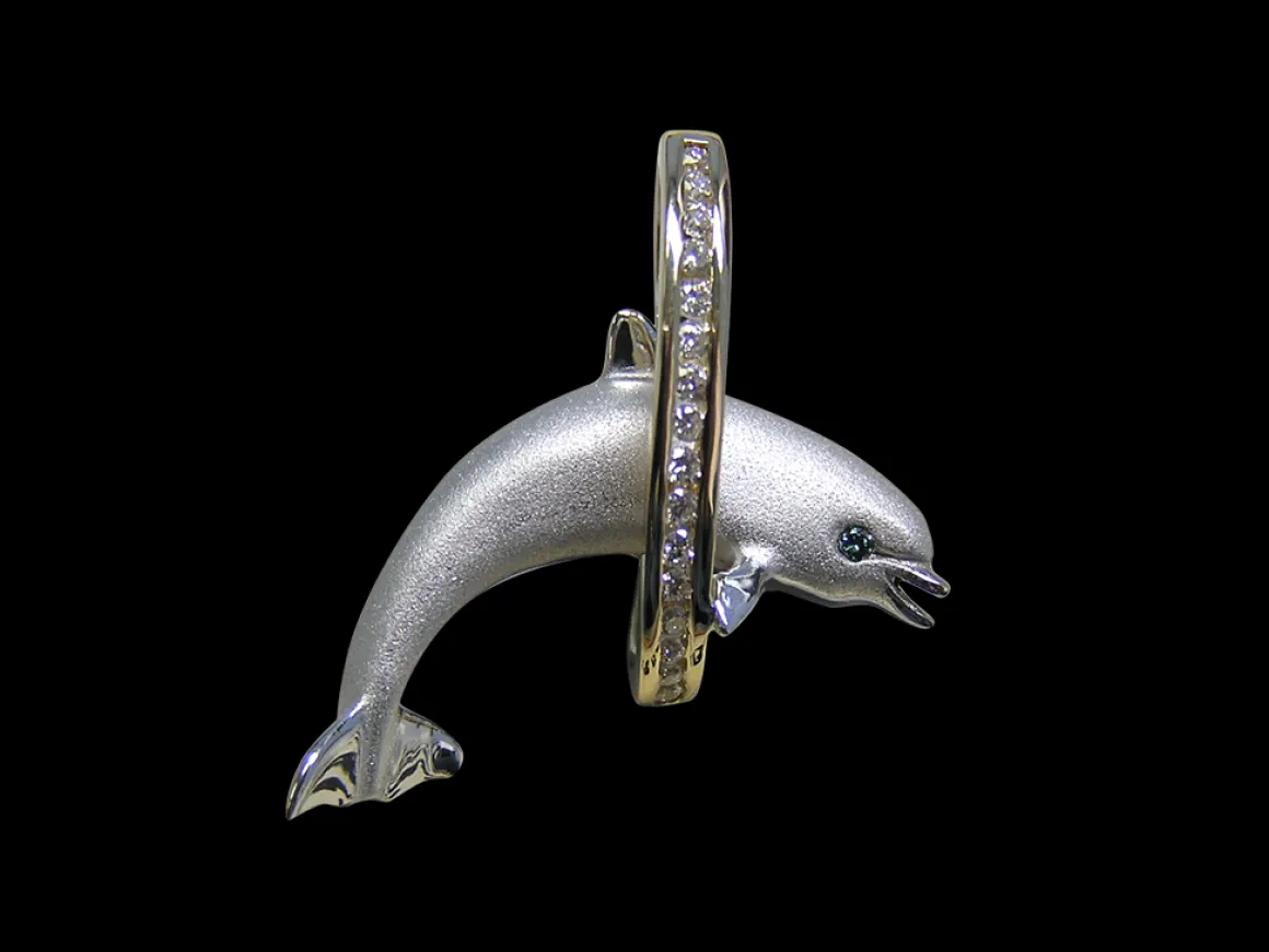 This is a14k 28mmgold pendantfinely handcrafted by Denny Wong.It features a singleblue diamond eyed dolphin jumping in a yellow gold loop.