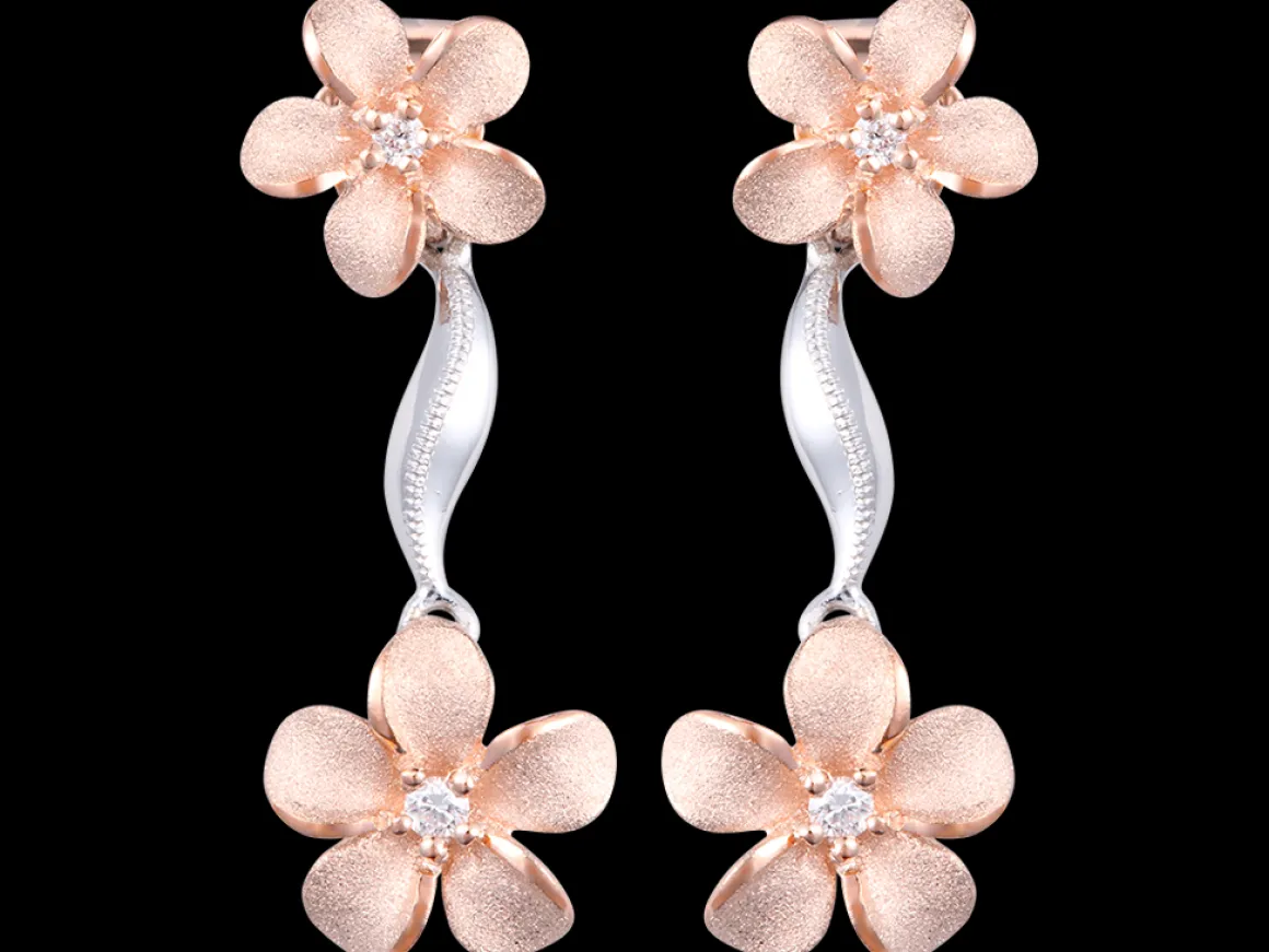 This plumeria lei earrings is made from 14k rose gold plumeria and white gold wave and features4 diamonds. The earring is made of solid gold with a sand blast finish.
