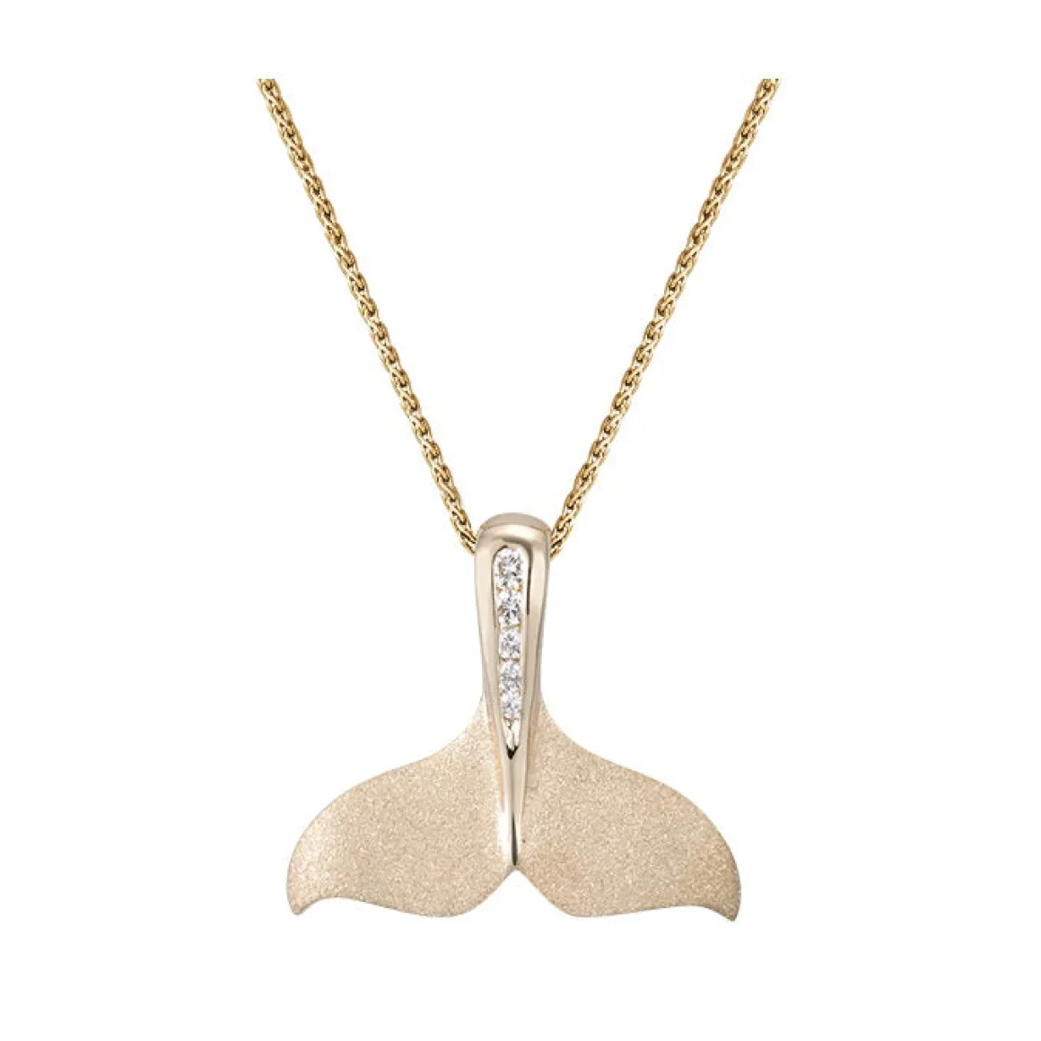 This is a 25mm14kgold pendantfinely handcrafted by Denny Wong.It features a whale tail with5 diamonds.