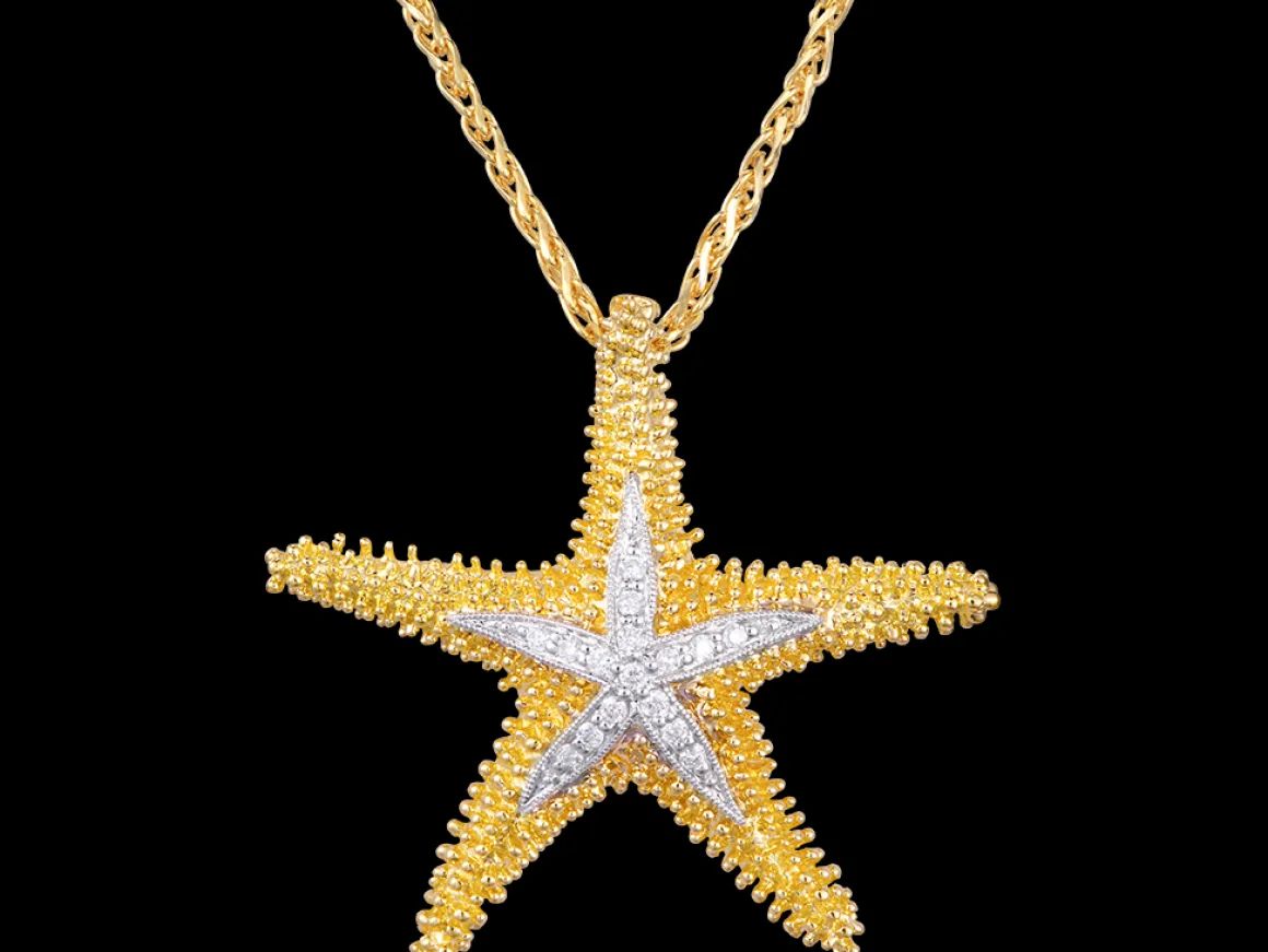 This is a14k 30mmstarfish pendant with sixteen diamondsfinely handcrafted by Denny Wong.