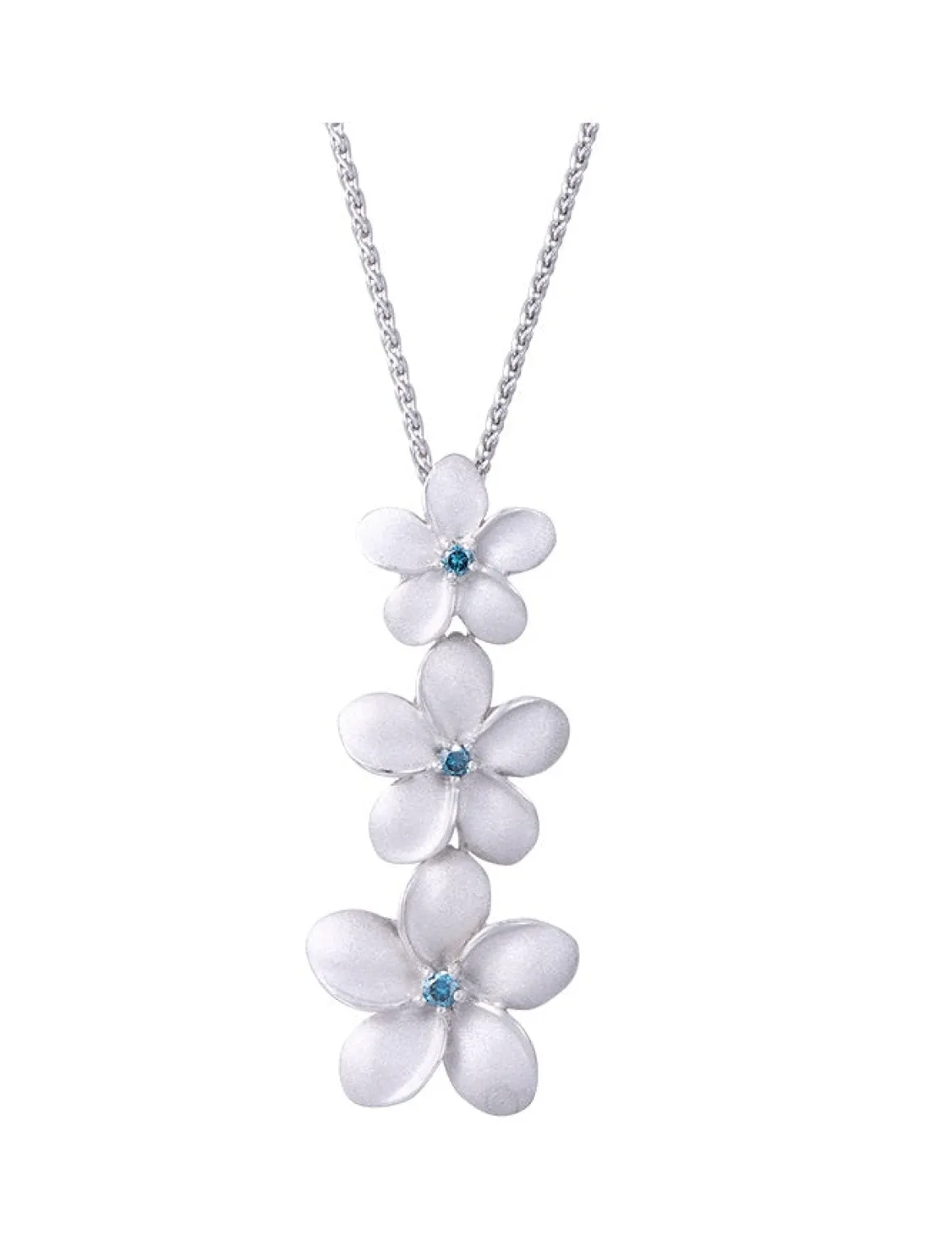Denny Wong did a great job creating this plumeria pendant. This is a lei pendant made from sandblasted 14K white gold & three 0.12 carats blue diamond. This is a slide pendant meaning it can slide throughout the entire chain.
