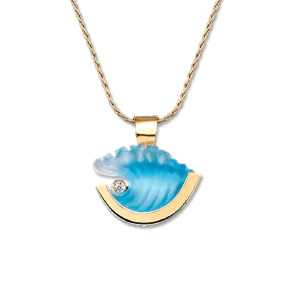 Matt Bezak makes this beautiful wave pendant entirely by hand. This wave pendant is made of 14k yellow gold and glass and features one .04 carat diamond. The blue wave portion is made of hand-casted glass.