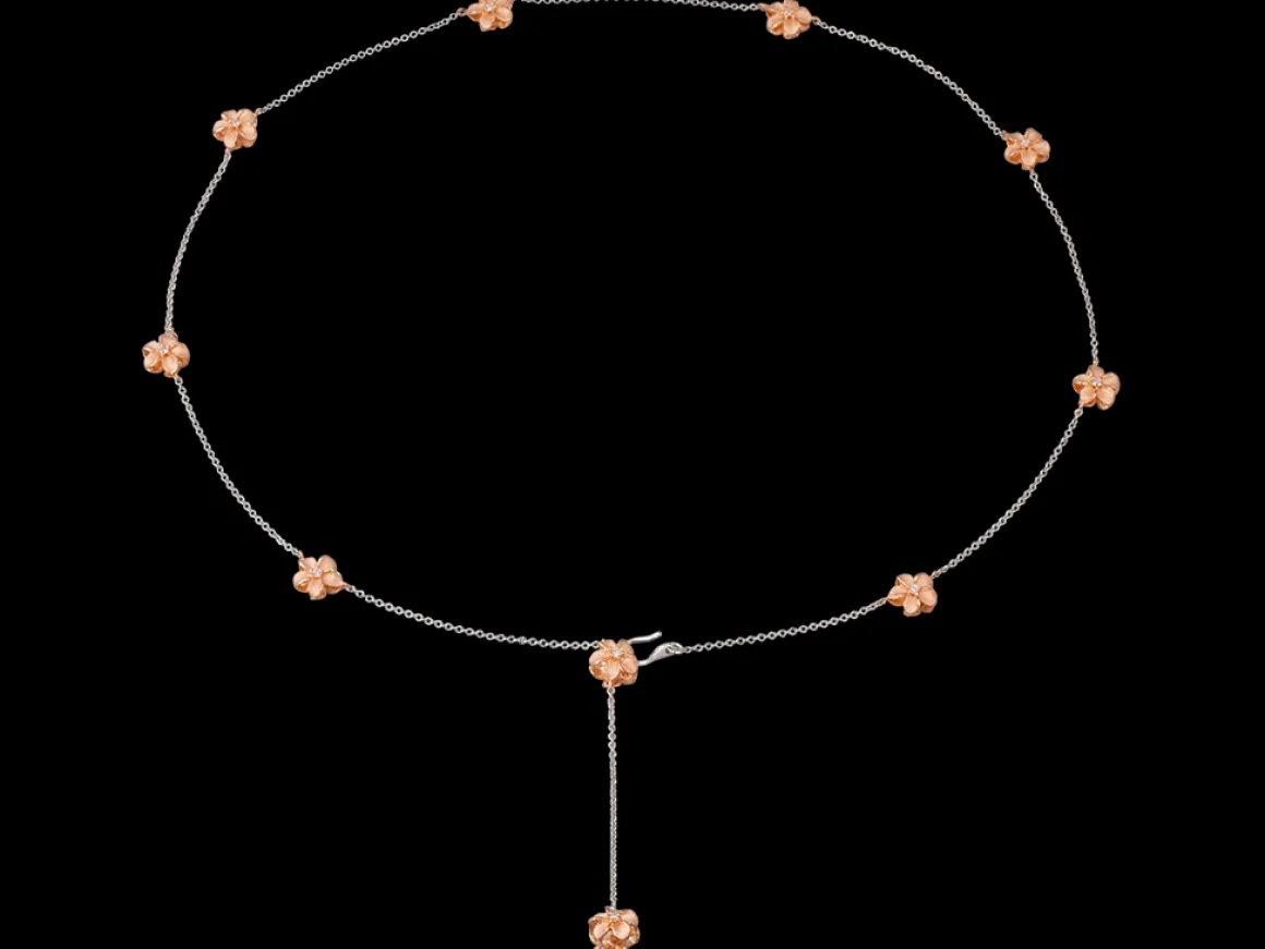 This is a 14k gold plumerianecklace by Denny Wong. It features 20 diamonds with white gold chain and rose gold plumeria.