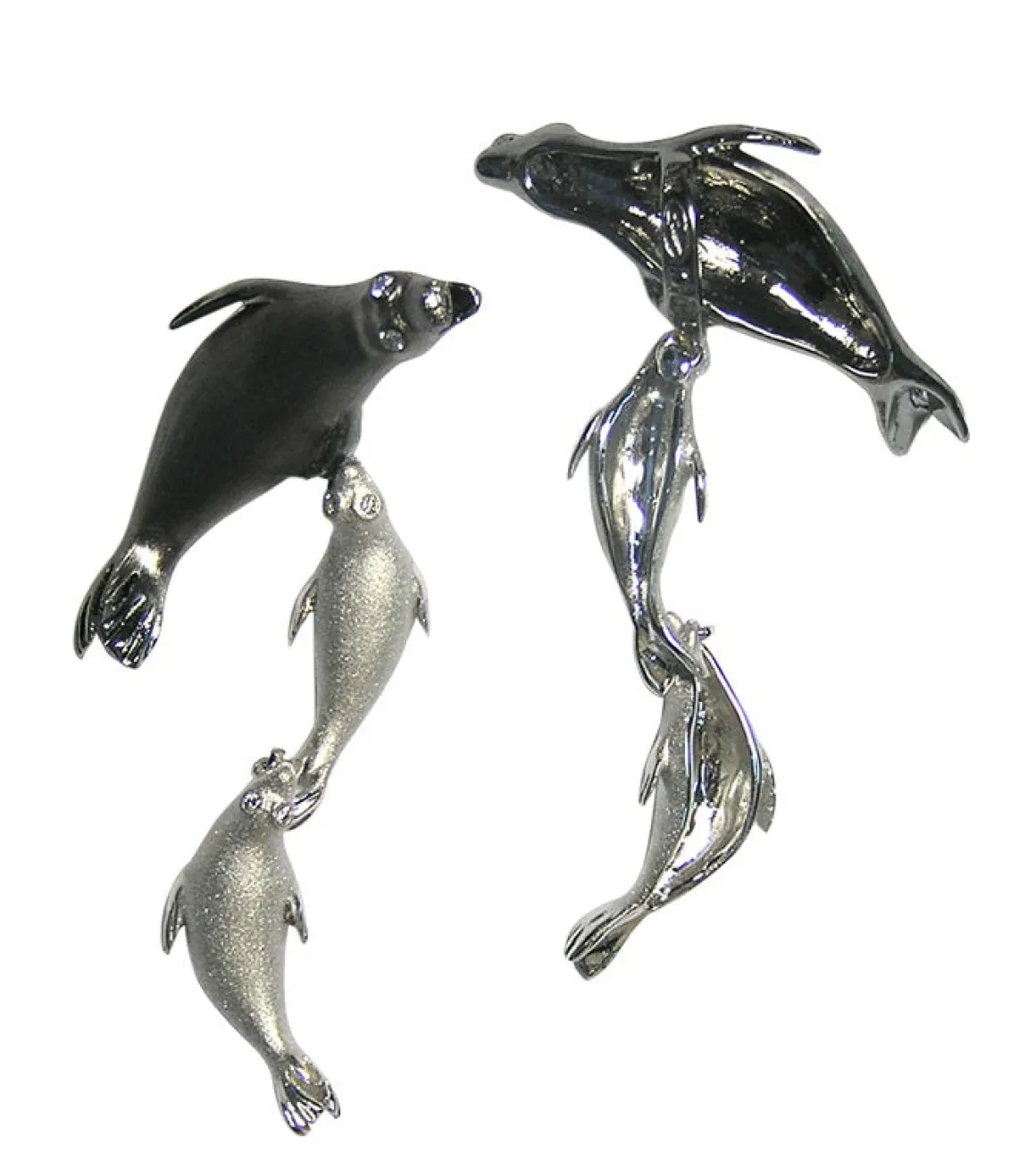 This pendant features a black rhodium mother seal with two 14k white gold babies seal dangling beneath her with 6 diamonds totaling in 0.05 carats.