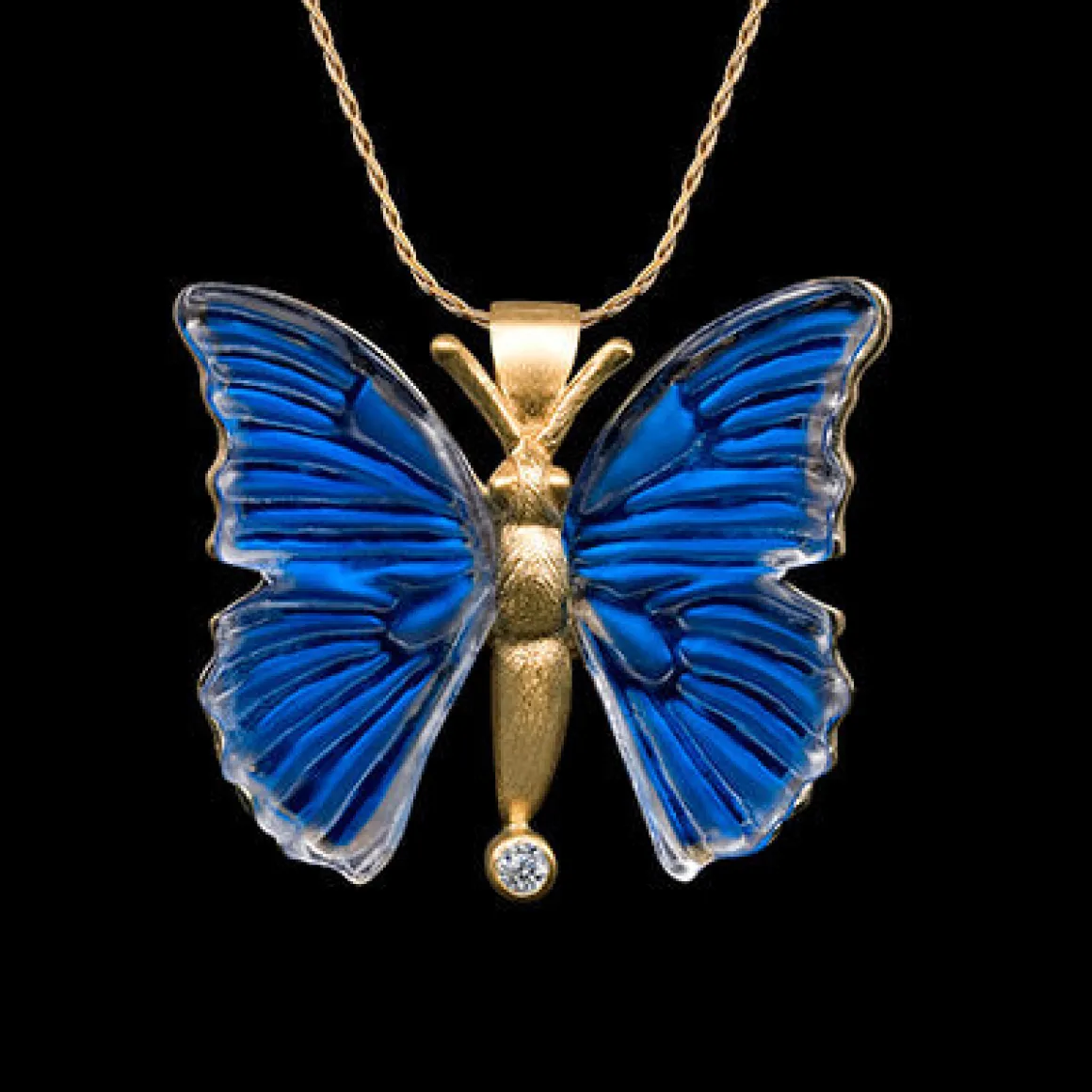 Matt Bezak’s animalia pendants are made entirely by hand upon order. This pendant is made of 14k yellowgold and glass. It features one diamond set at the base of the butterfly. The butterflyportion is made of hand-casted glass, which gives this pendant an incredibly unique and original look.