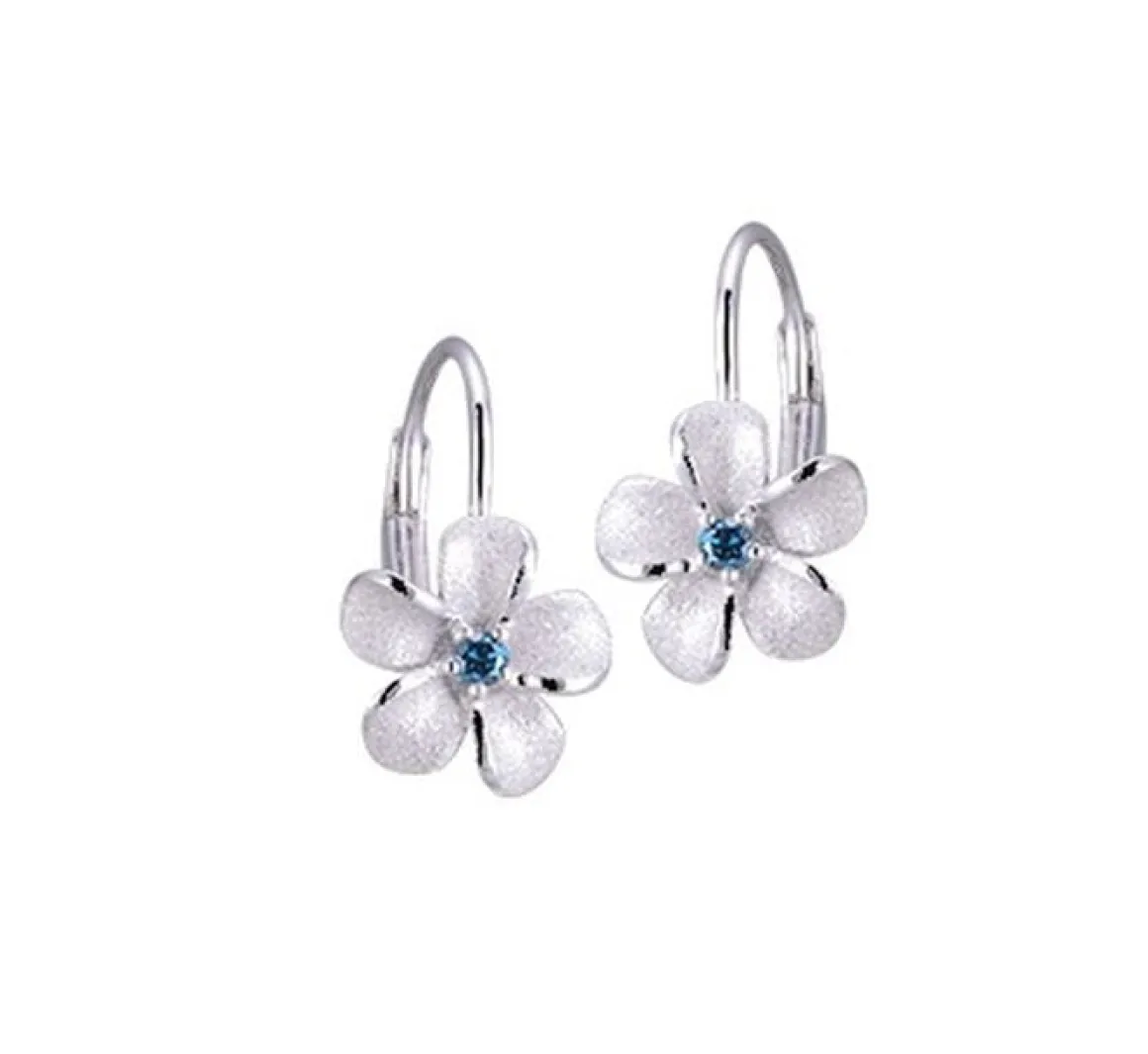 14kw 8mm plumeria earrings w/sand blast finish, lever back, w/2 blue dia t/w .02ct