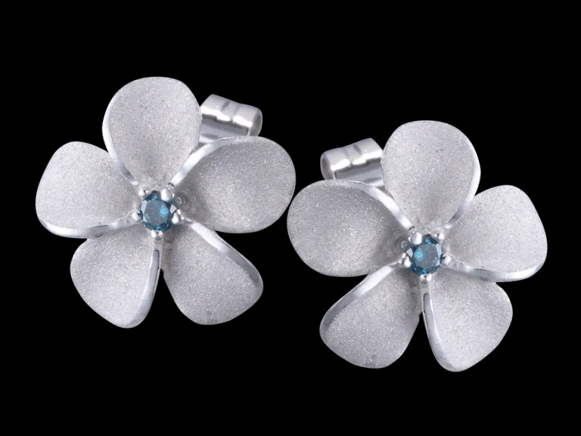 The plumeria collection by Denny Wong is one of his most famous collections. This earring features an 11mm sandblasted 14k gold plumeria and two blue diamonds.Capture your favorite memory of the Hawaiian Islands with this beautiful piece.