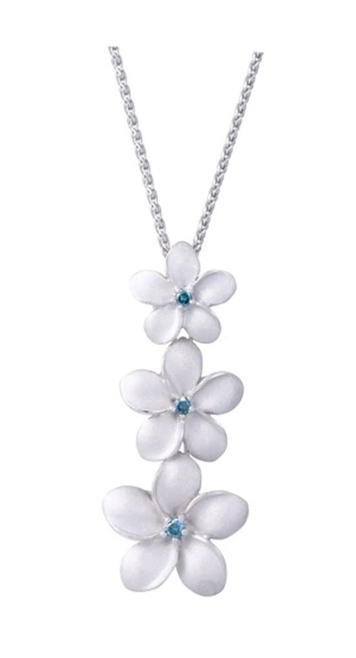 Denny Wong did a great job creating this plumeria pendant. This is a lei slide pendant made from sandblasted 14K white gold & three 0.08 carat blue diamonds. This is a slide pendant meaning it can slide throughout the entire chain.