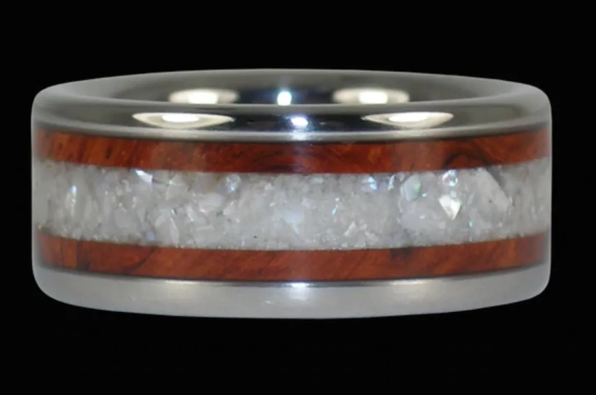 Titanium ring for a special Fathers Day gift for husband or Dad to enjoy every day. Beautiful dark red Amboina wood is perfect for Christmas, and can be worn all year round. Beautiful rings as a matching set for couples to share more than design. Amboina wood is one of the most valuable woods on the market and goes great with gemstone.