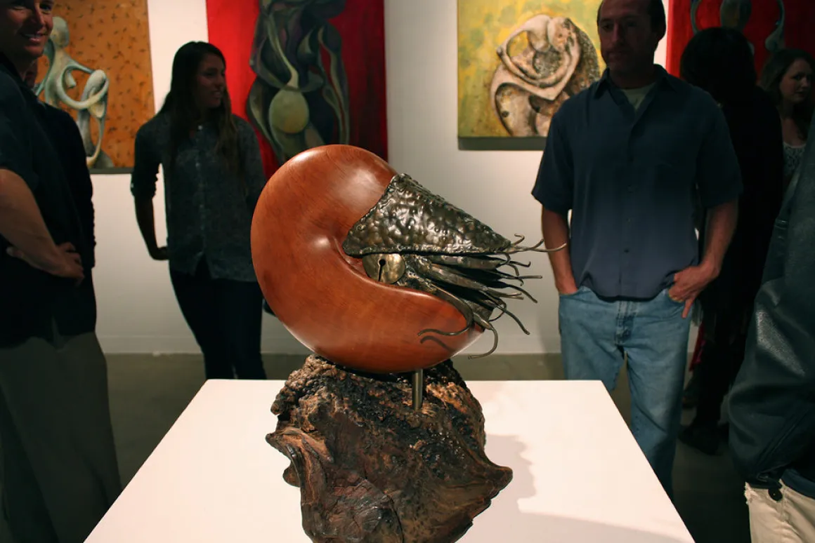 Considered to be a living fossil, nautiluses are ancient relatives of squid. Unlike squid, they have a shell, which has a series of chambers where air is added or subtracted to obtain neutral buoyancy. In all renditions of Ancient Mariner, the the body of the nautilus is forged and welded of bronze, while the shell has been carved from various rare or exotic woods, including quillo bordon and curly redwood. Bases for Ancient Mariner have varied from manzanita burl to driftwood, for both tabletop display and wall mounting.
