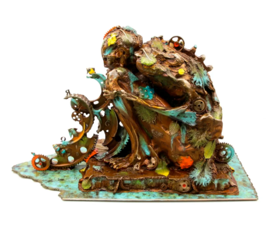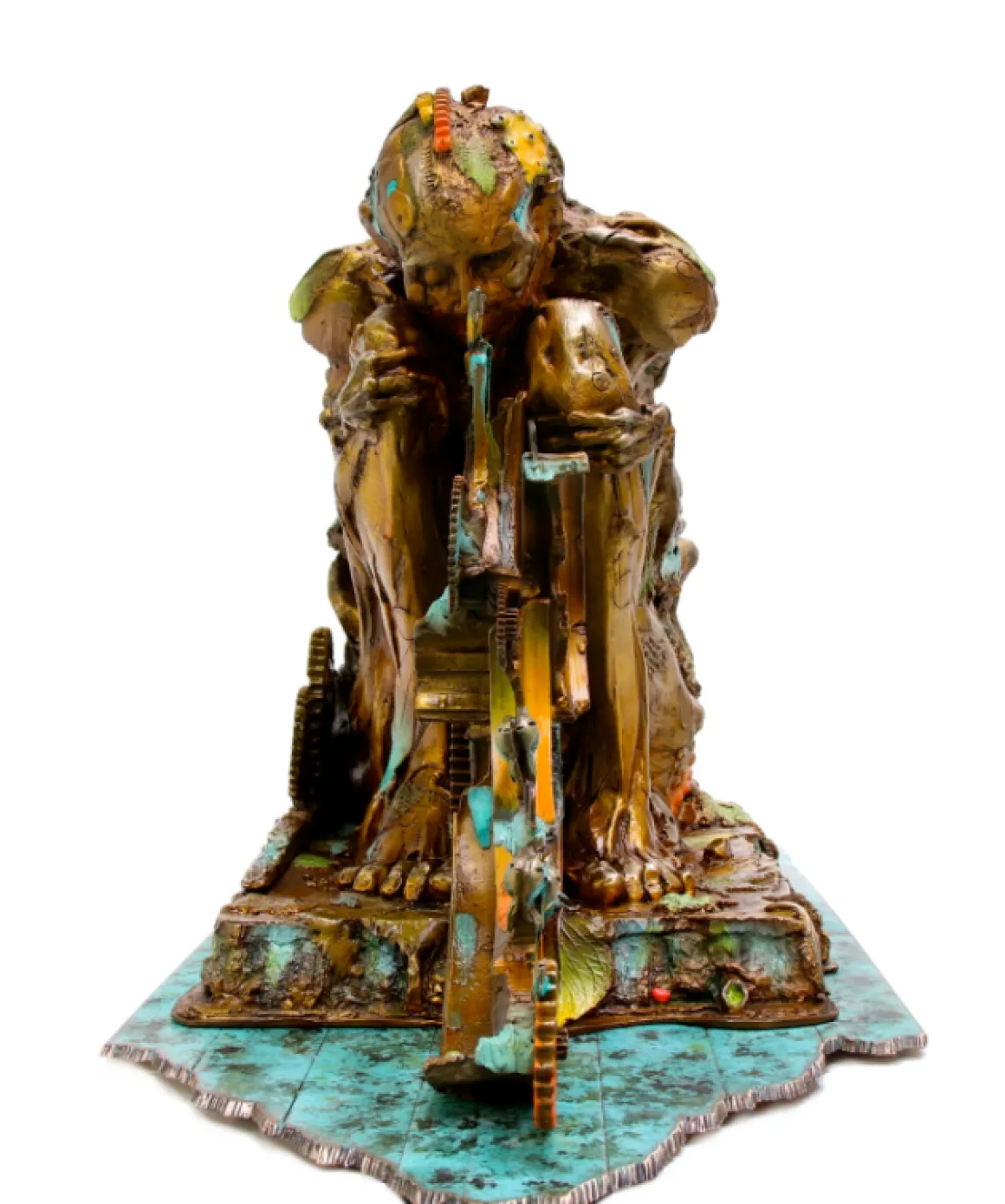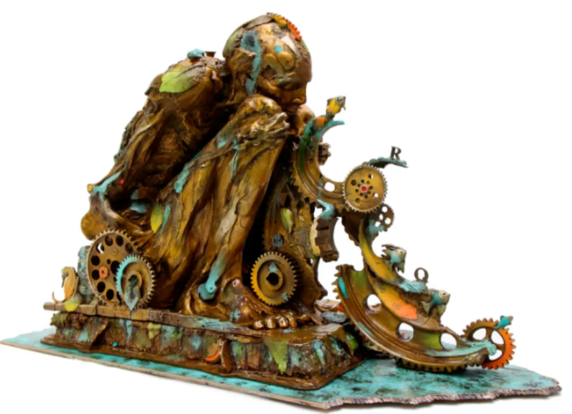 Autumn Man is a profound bronze sculpture depicting a cloaked figure lost in deep contemplation. Wrapped in flowing robes that cascade like autumn leaves, the figure sits hunched in thought upon an elaborate mechanical base—a meditation on the intersection of humanity, nature, and time. The warm amber and golden patinas evoke the colors of fall, while turquoise accents flow through the composition like streams of memory. Gears and cogs emerge from the base, suggesting the unstoppable mechanism of time and seasonal change. A smaller element extends from the base like fallen leaves caught in clockwork. At 170 pounds and 27 inches wide, this is a substantial museum-quality piece that commands attention and invites reflection. A powerful statement for contemplative spaces.