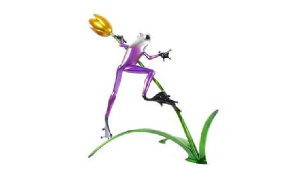 Now for sale online at Dolphin Galleries! The Belle Fleur.A lavender frog anxiously climbs the stem of a gold nitrate tulip.
