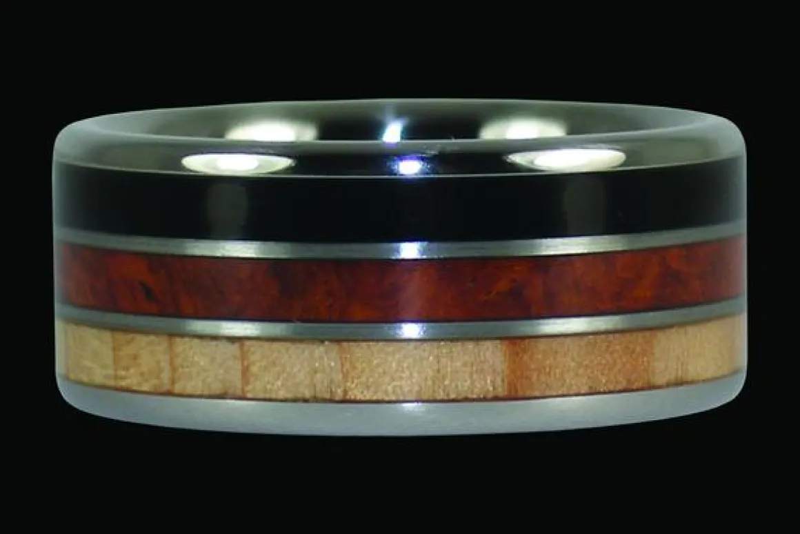 Big Kahuna titanium ring design shown with three woods; Black Ebony, Amboyna, and Hemlock. Perfect for men and women who like a wider ring. Triple wood bands for elegance and environmental appreciation. Preserve your favorite wood and showcase it for a lifetime.