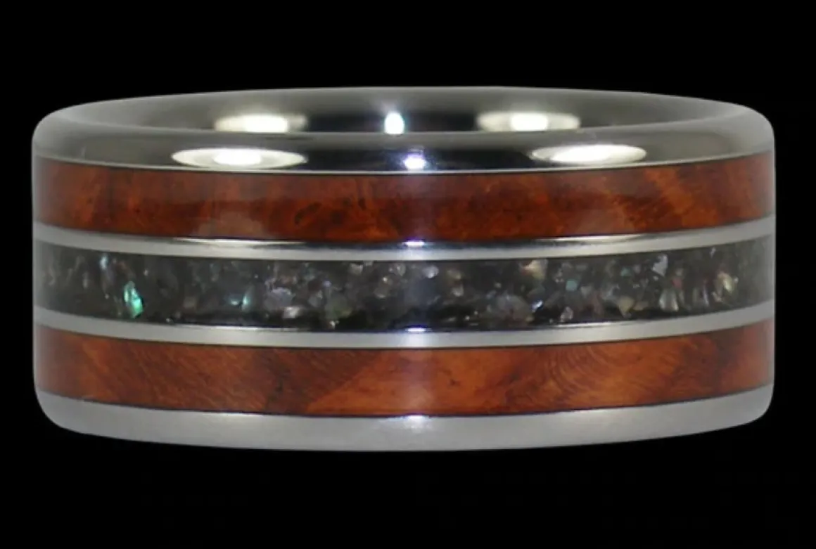 Titanium ring for your Kane or Wahine handmade with Aloha on the Big Island of Hawaii. Our Big Kahuna design; perfect Hawaiian wedding rings with gorgeous custom craftsmanship featuring Black Pearl and your choice of wood inlay, this one is shown with Amboyna wood. Choose White pearl too! Amboyna wood is the curliest wood we offer and one of the rarest woods available.