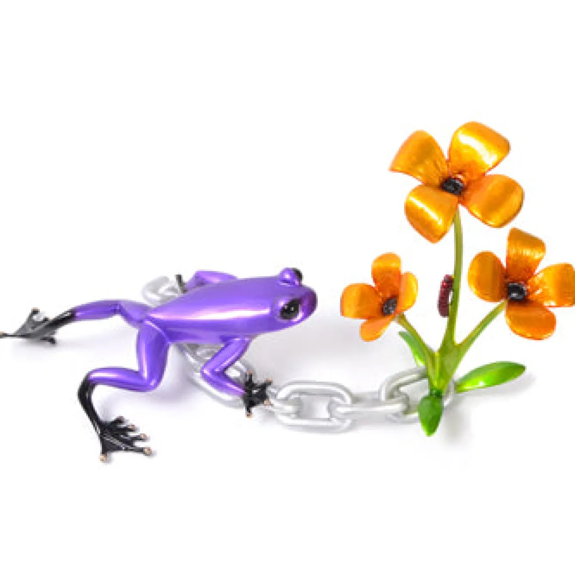 Now for sale online at Dolphin Galleries! The California Gold.According to Wikipedia, a wildflower is a flower that grows where it was not intentionally seeded or planted, even if it is growing where it would not naturally grow. Randomly linked by a silver chain, variegated gold petals contrast beautifully with a saturated purple frog. California Gold, Tim Cotterill’s 2021 Mother’s Day sculpture, clearly exemplifies this natural phenomenon.