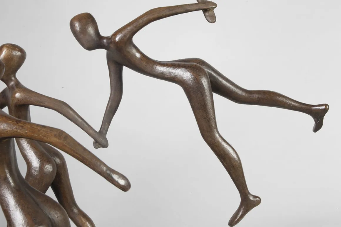 Circle of Life 11 presents a striking meditation on human interconnection. Dark bronze figures stand hand-in-hand at the base while above them, bodies form an eternal wheel—each figure reaching toward the next, creating a circle without beginning or end.