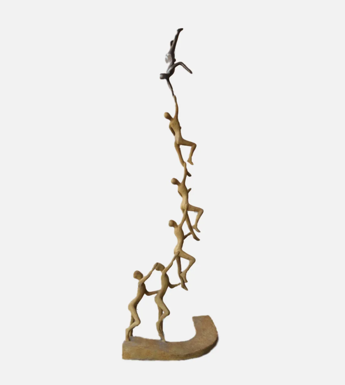 This sculpture captures the essence of human interdependence with stunning visual poetry. The warm, luminous patina of the supporting figures contrasts beautifully with the darker figure at the summit, suggesting that those who achieve great heights carry with them the energy and sacrifice of everyone who helped them climb.
