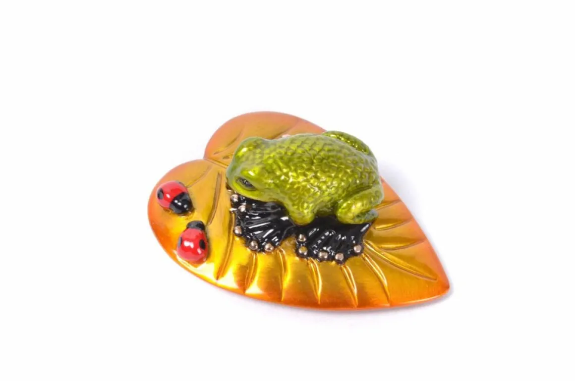 Now for sale online at Dolphin Galleries! The Elf. A textured green toad perches atop a copper-toned leaf, fixated by two brilliant red ladybugs. Elf, Tim Cotterill’s 2020 holiday release, is certain to bring yuletide cheer to the Frogman pond.