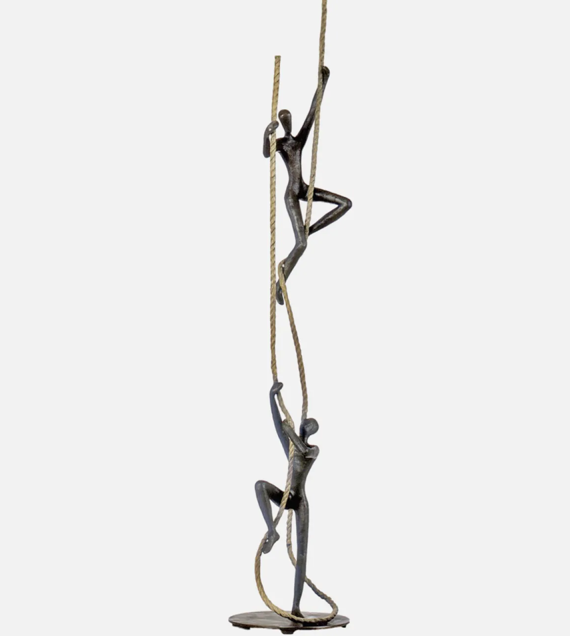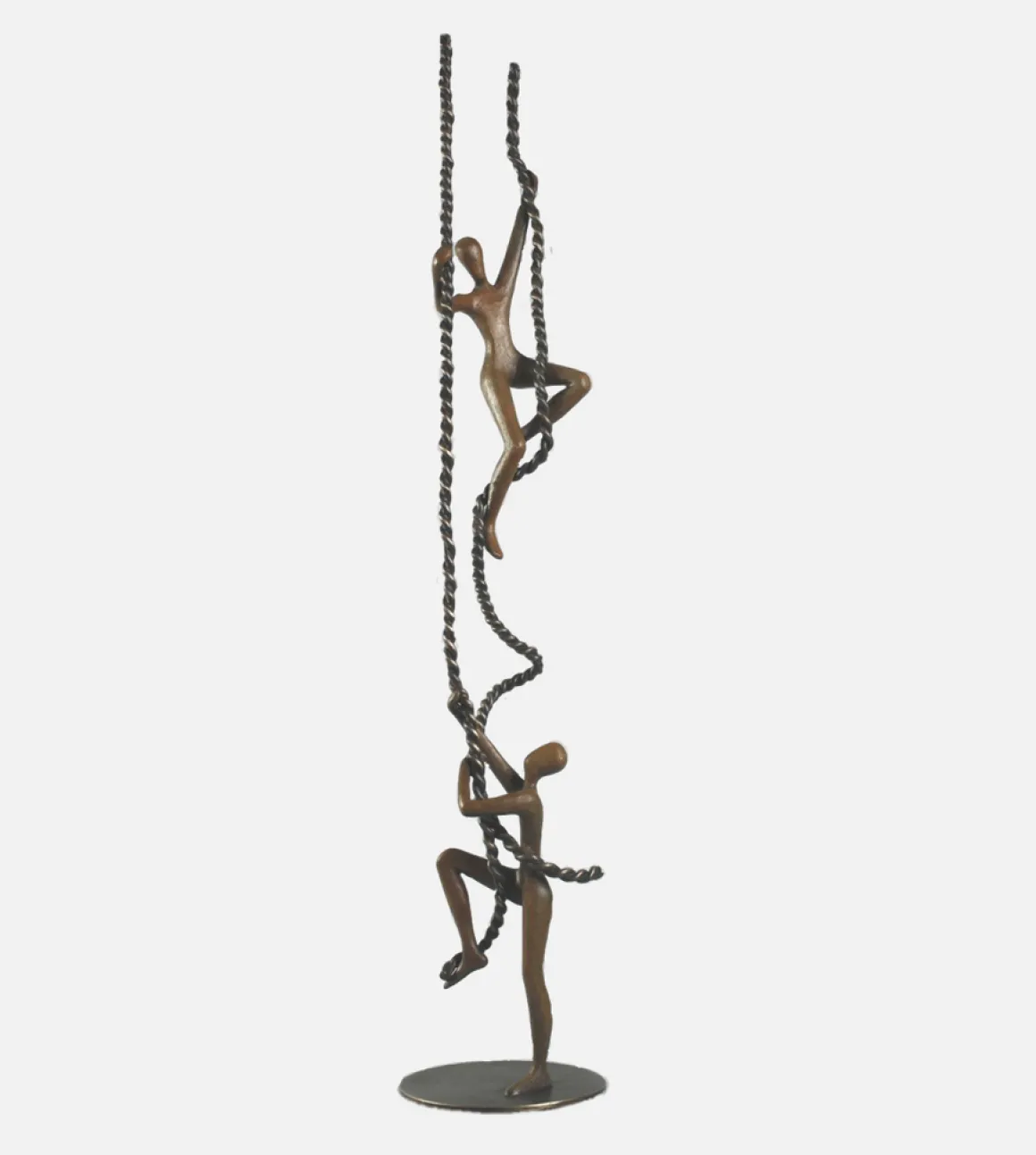 Tolla Inbar’s elegant composition rises from a simple circular base, with the warm patina of the figures contrasting against the dark braided ropes. The vertical ascent creates a sense of progress and hope—the unmistakable feeling that with the right encouragement, any height is reachable.