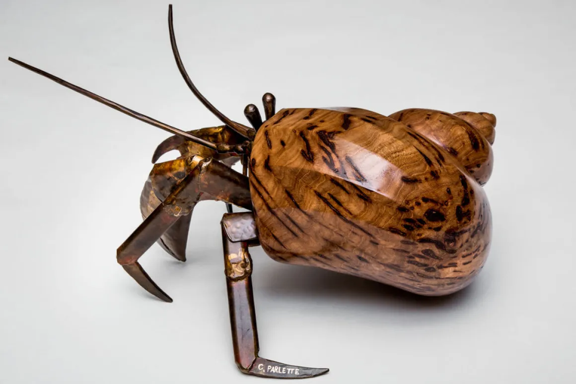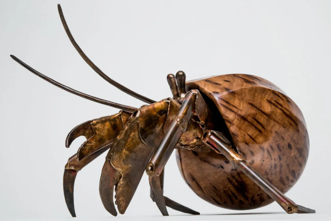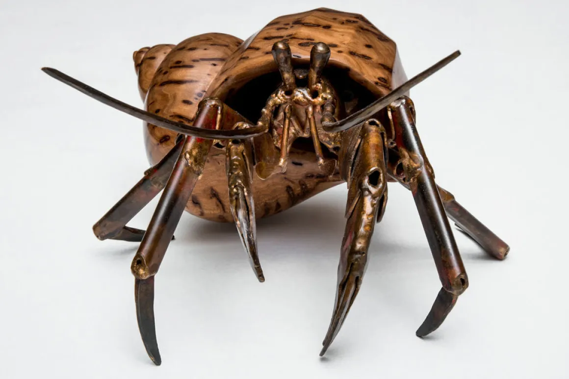 A hermit crab is always on the lookout for the next best shell. All renditions of Finders Keepers feature a welded bronze hermit crab in a dashing wood shell. Seen here: acacia and walnut.