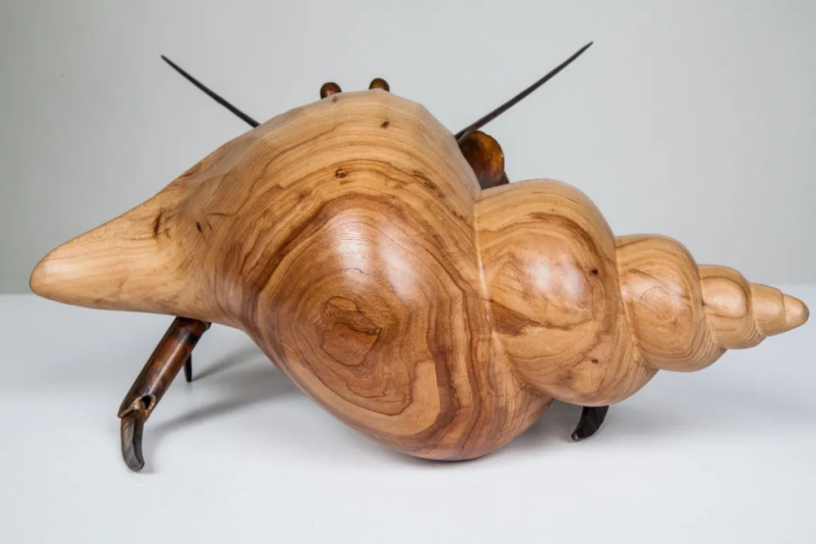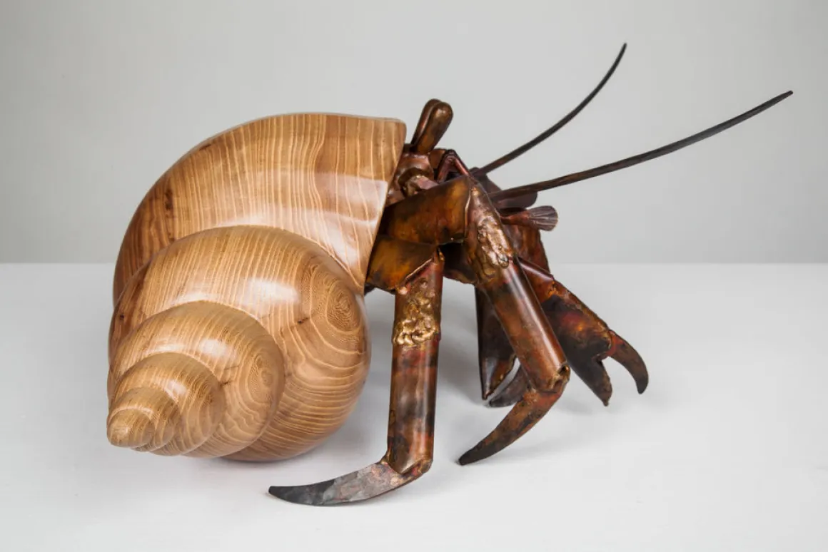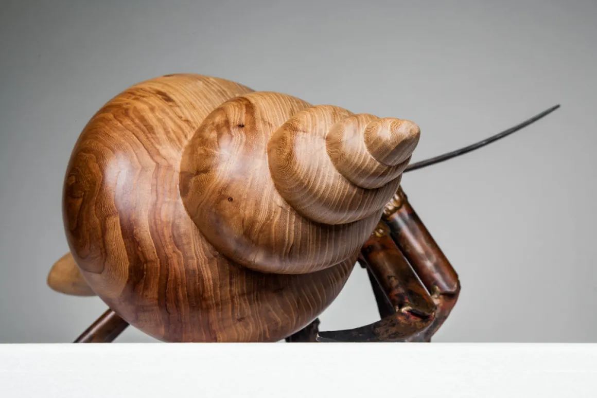 A hermit crab is always on the lookout for the next best shell. All renditions of Finders Keepers feature a welded bronze hermit crab in a dashing wood shell. Seen here: acacia and walnut.