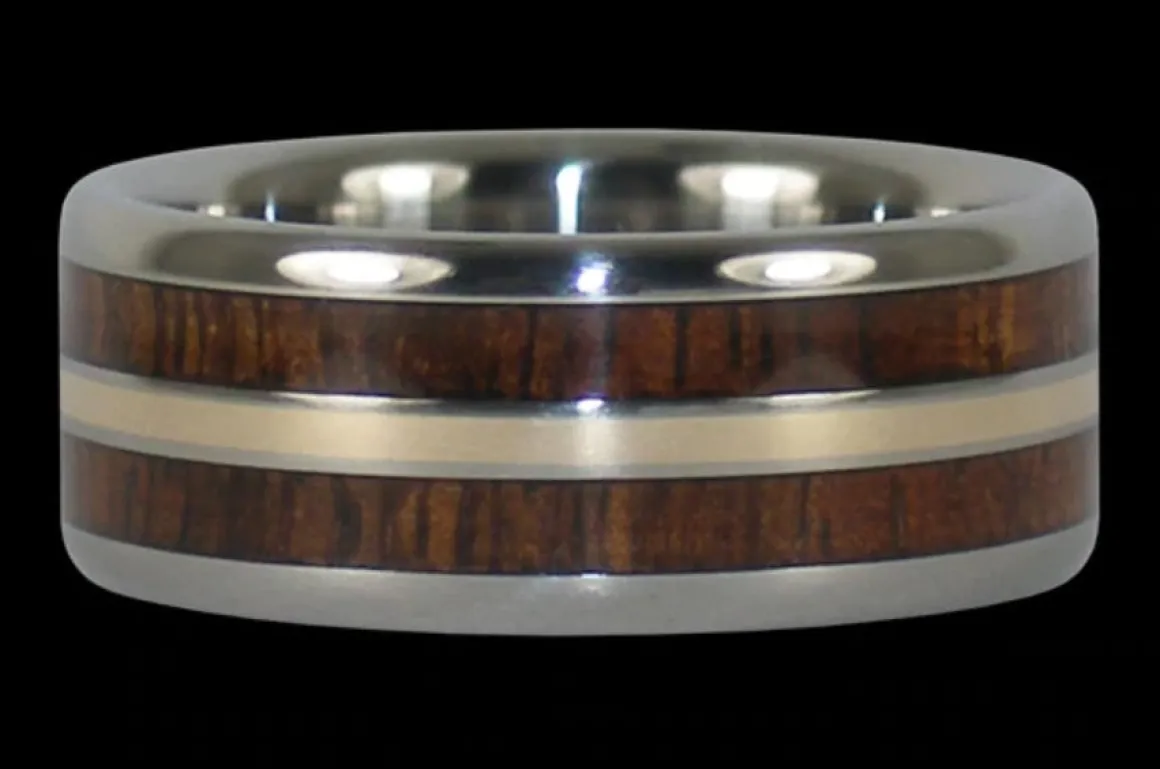 With rich dark Hawaiian Koa wood and a band of yellow gold inlay; perfect gift for a man or woman to enjoy everyday, beautiful as a matching set made from the same cut of wood. Elegance and style with durable quality craftsmanship. Long lasting beauty with a lifetime guarantee. Tiger Koa wood’s texture resembles the stripes of a tiger; it is caused by the weight of the tree causing it to sink and collapse while continuing to grow.