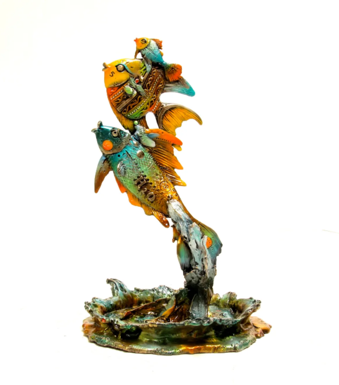 This exuberant family of four fish captures the pure joy of leaping through warm tropical waters. Stacked vertically in a dynamic upward spiral, Henry, Stella, and their twins burst from an intricately sculpted water splash base in brilliant hues of turquoise, orange, yellow, and sea green. Each fish is adorned with Nano Lopez’s signature decorative elements—dots, patterns, and whimsical details—creating a sense of playful movement and familial connection. The piece radiates energy and the simple pleasures of catching air on a sunny day.