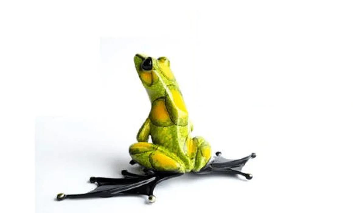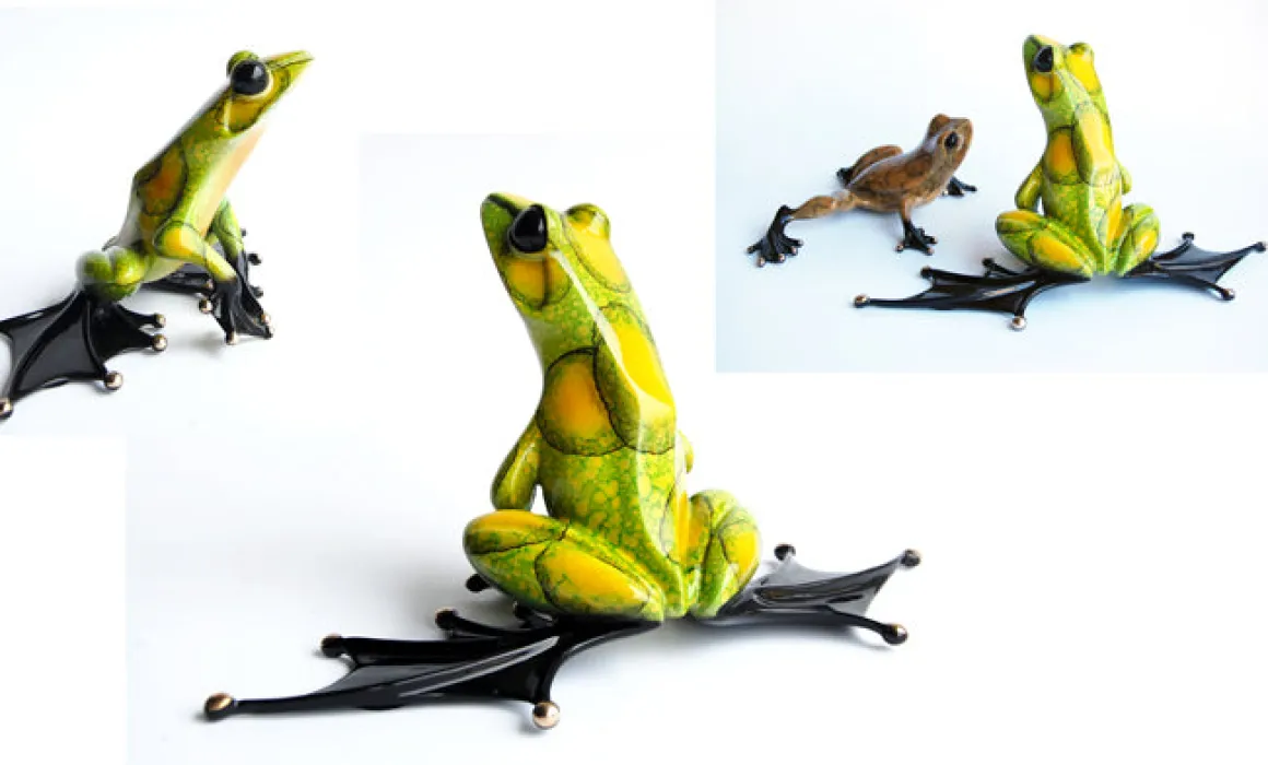 Now for sale online at Dolphin Galleries! The Jump Start. A bold piece of art in a very zesty yellow on yellow-green patina.An impressive sculpture indeed!