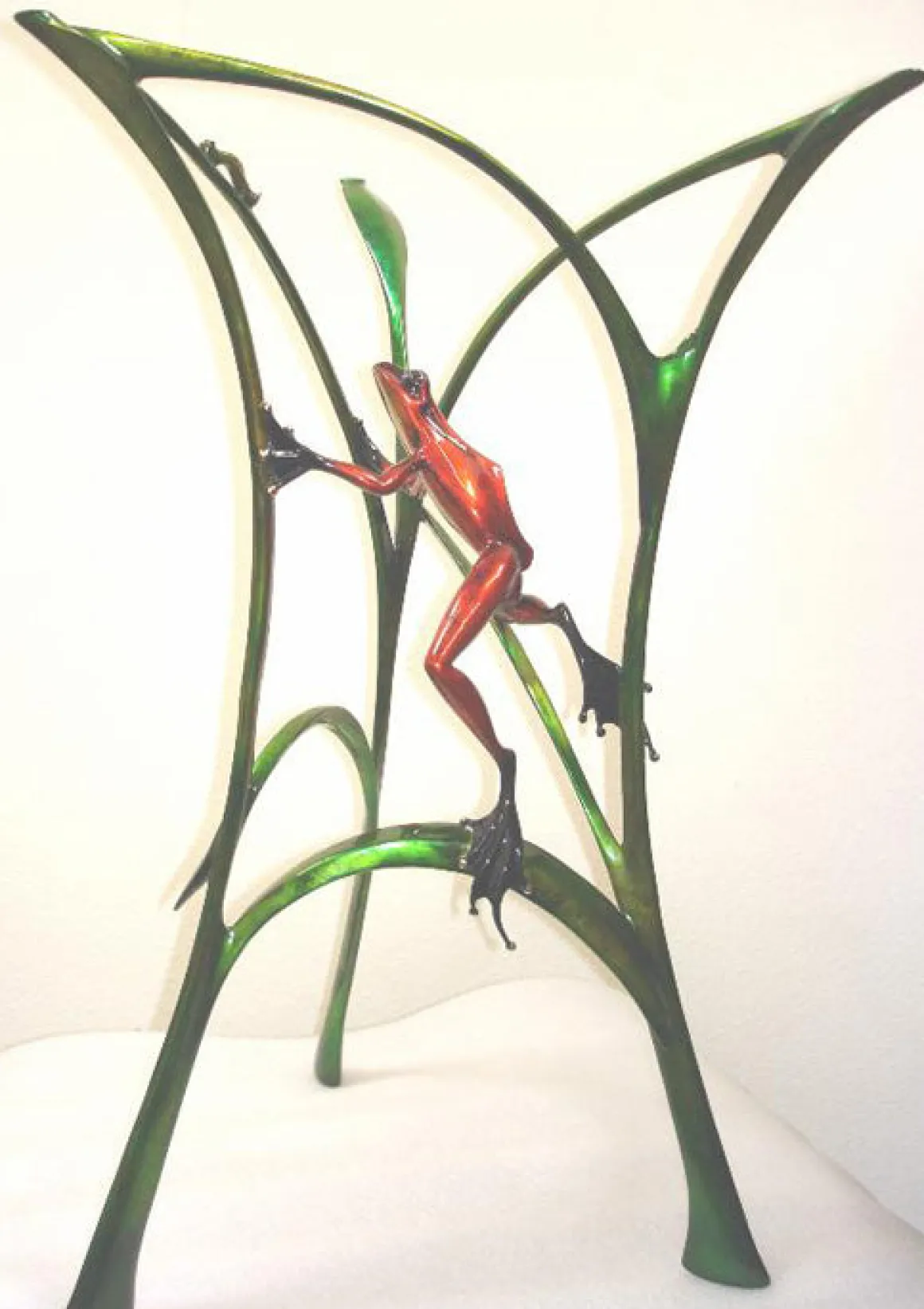 Now for sale online at Dolphin Galleries! The Let’s do Lunch is agorgeous creation featuring vertical grass blades and a large metallic red frog climbing up toward a golden caterpillar.Ships to you without glass so you can order the exact size you need for your space.