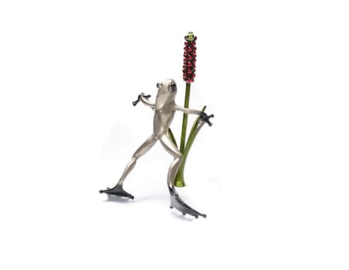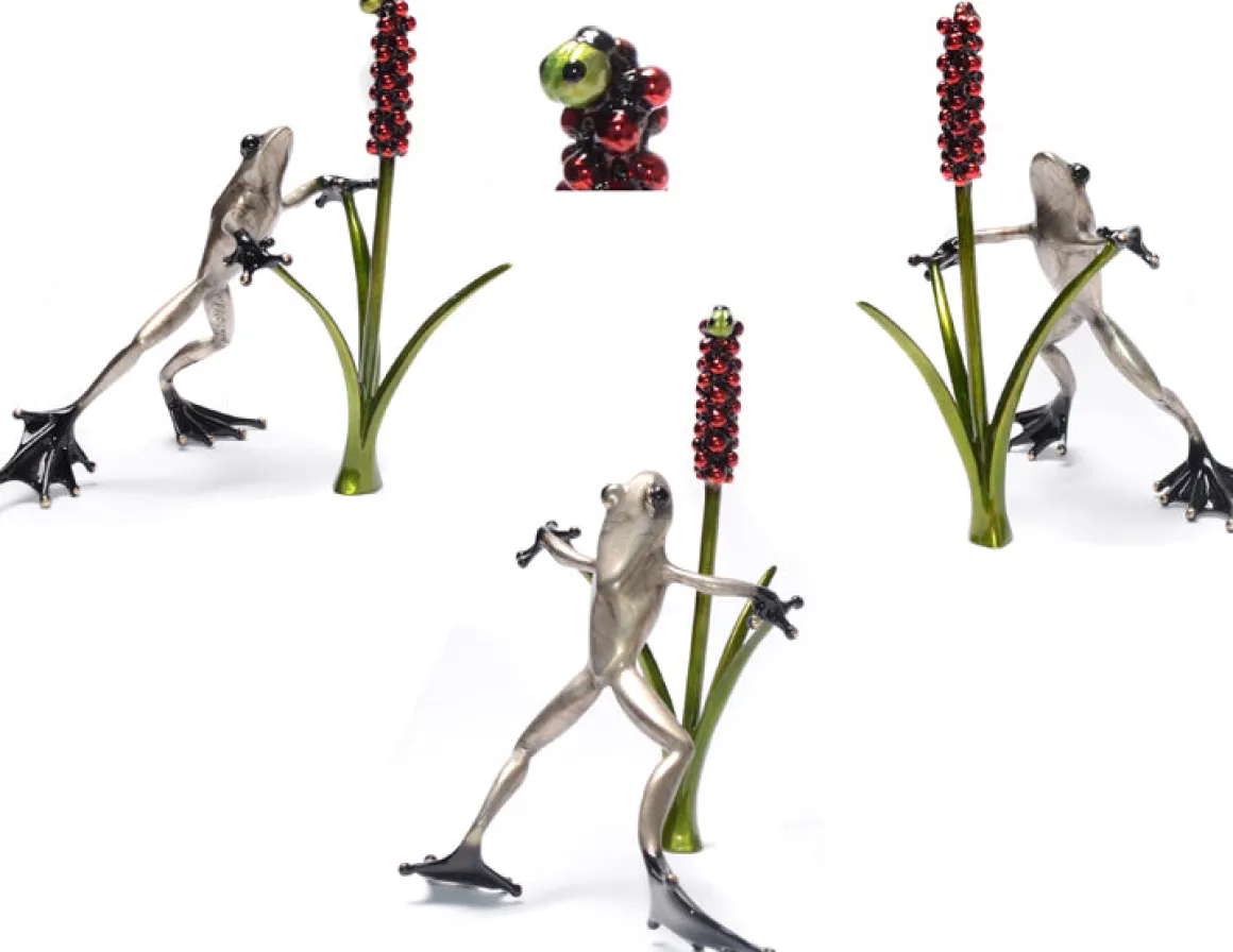 Now for sale online at Dolphin Galleries! The Lords and Ladies.This sculpture features a silver frog looking up at a ladybug sitting on top of a red lords-and-ladies flower.