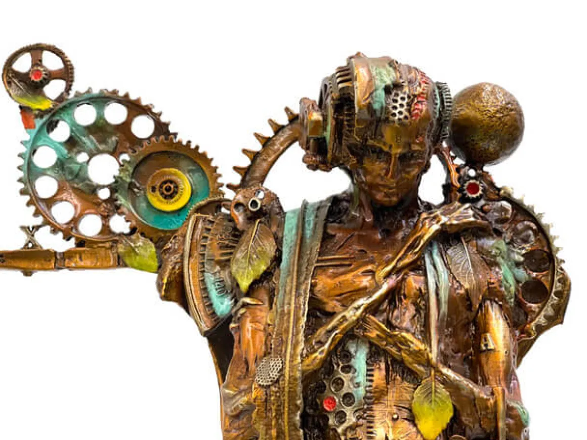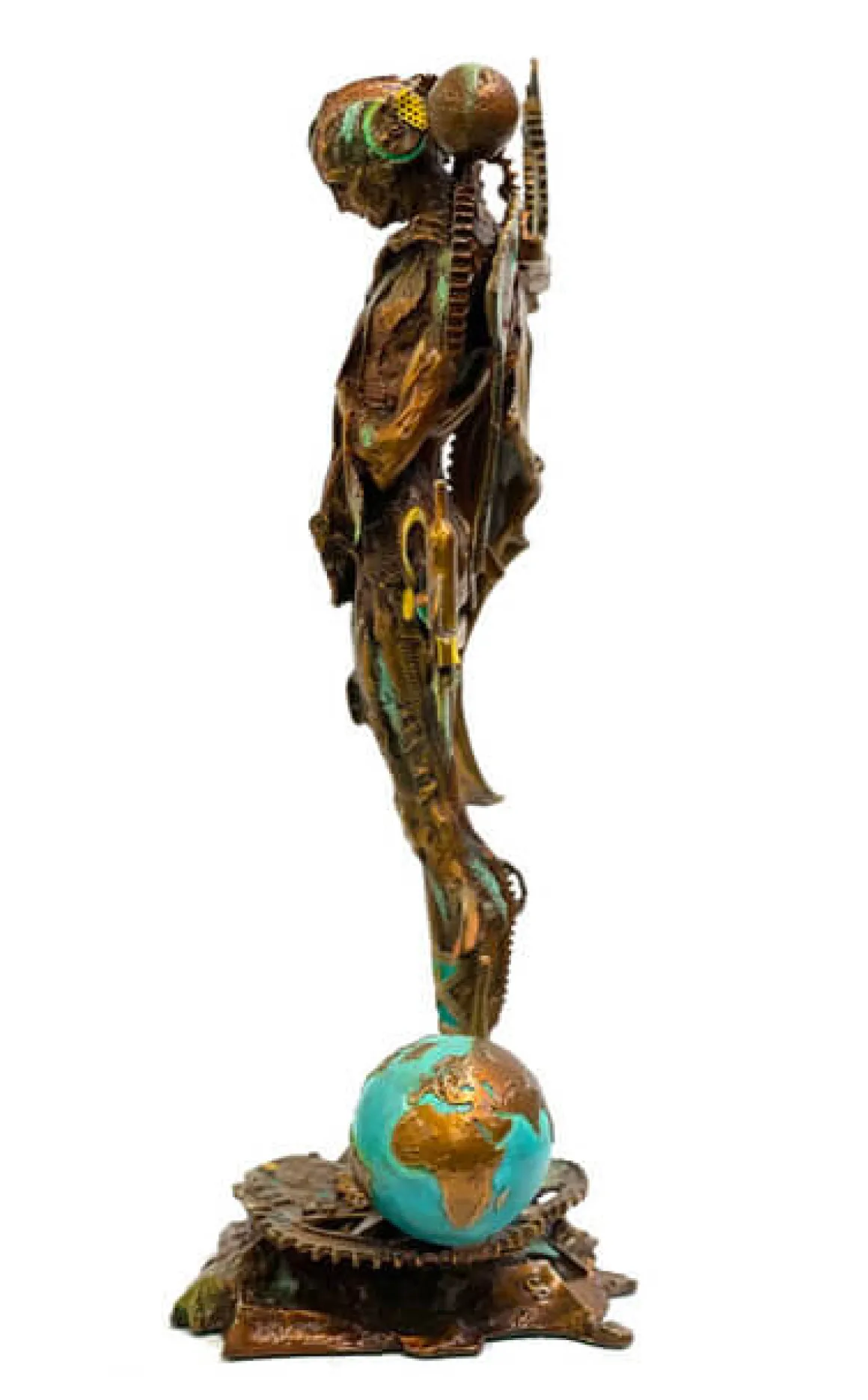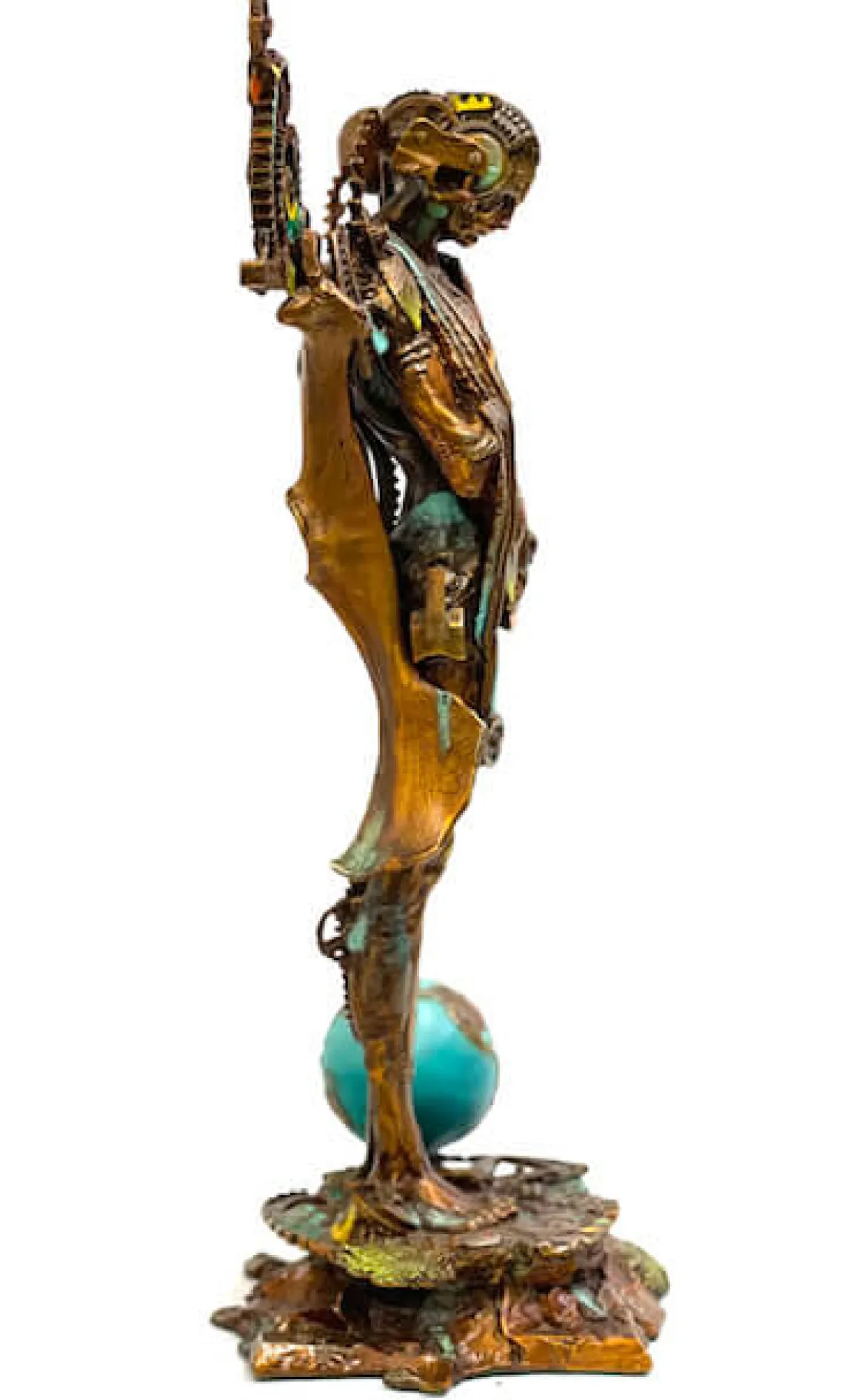 Man dot Earth Medium presents Nano Lopez’s profound meditation on humanity’s relationship with our planet in an accessible tabletop scale. This striking figure stands at the crossroads of nature and industry—a human form interwoven with intricate clockwork gears, cogs, and mechanical elements. His outstretched arms form a living scale: one side bearing elaborate turquoise-accented gear mechanisms, the other holding scientific instruments and bottles representing human knowledge and discovery. A luminous turquoise globe—Earth herself—rests at his feet, a reminder of what hangs in the balance. The rich bronze patinas blend with striking teal accents throughout, while compass directions on the base orient him to the cardinal points of our world. This medium size offers the complete impact of the design while fitting comfortably on a desk, shelf, or pedestal.