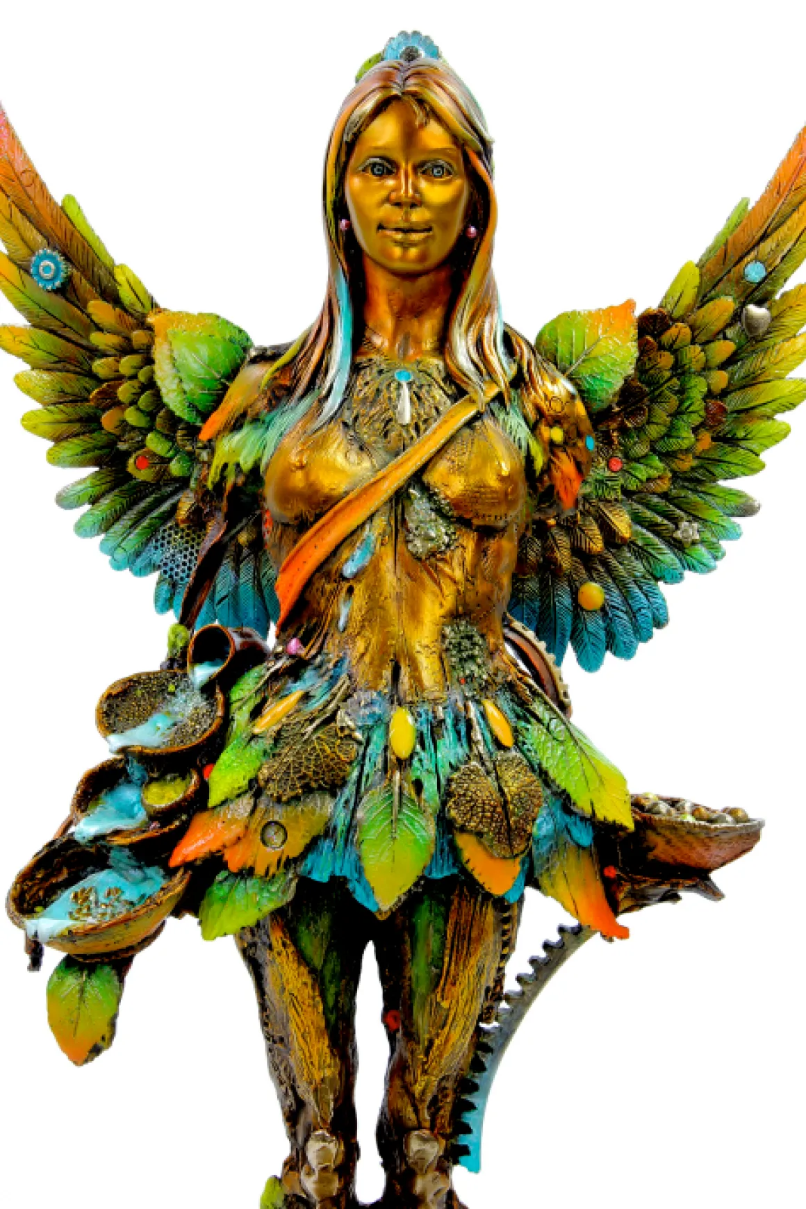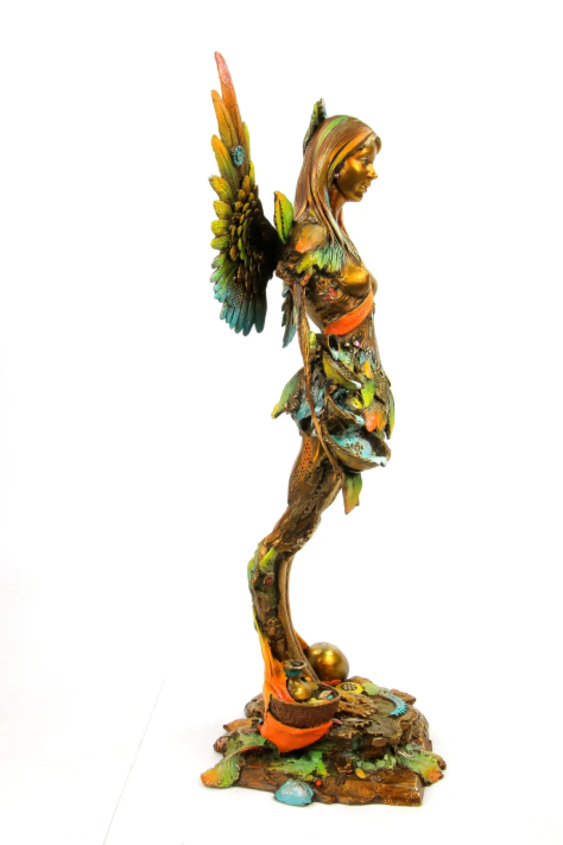 Maria and the Seeds is a breathtaking bronze sculpture depicting a serene, angelic figure who embodies the eternal cycle of nature and nurturing. This winged goddess stands gracefully, her magnificent feathered wings spreading wide in a spectacular display of color—shimmering teals and emerald greens at the base transition to warm golds and coral-tipped edges, creating the effect of tropical plumage. She cradles seeds close to her heart, the source of all life, while wearing an elaborate dress fashioned from leaves and petals that flutter around her slender form. The richly detailed base overflows with fruits, vegetables, and organic elements, accompanied by a small chameleon—nature’s guardian creatures gathered at her feet. Every surface reveals Nano Lopez’s masterful patina work, blending warm bronzes with vibrant natural hues.