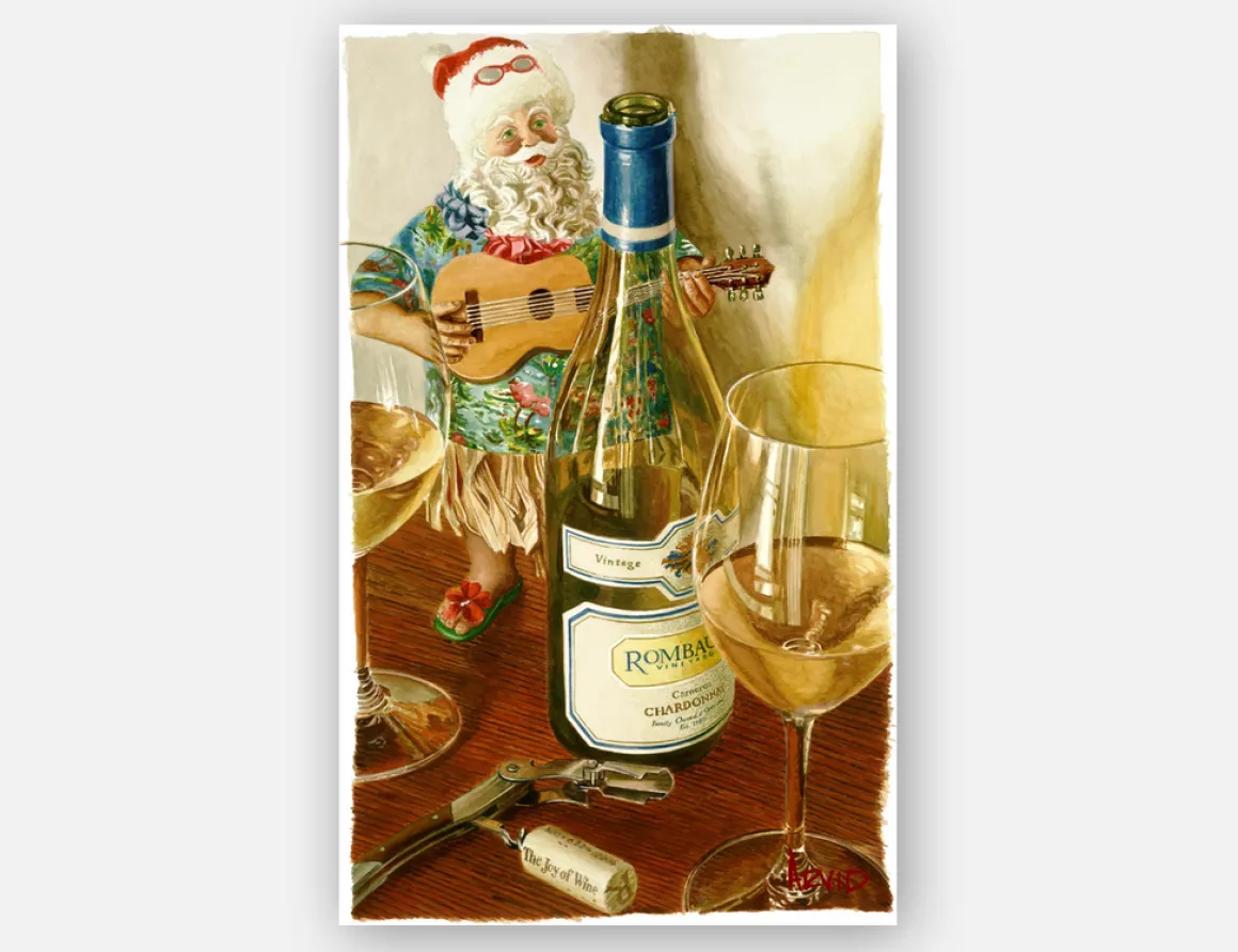 Inspired by his recent move to Maui after spending several Christmases there with his family, Arvid adds a little whimsy to his annual holiday watercolor with the musically inspired “Mele Kalikimaka.” Strumming his ukulele in the warm Hawaiian sunshine and spreading aloha to all, Santa can’t wait to share his “liquid sunshine” and to celebrate with friends and family (he sounds like a certain artist we know). If you are lucky enough to be in Maui for Christmas, you are likely to find Arvid strumming his ukulele at sunset, with a bottle of chardonnay and a group of friends to share it. And do look for #flatmauisanta to be trending – like Arvid, he loves adventures and makes friends everywhere he goes.