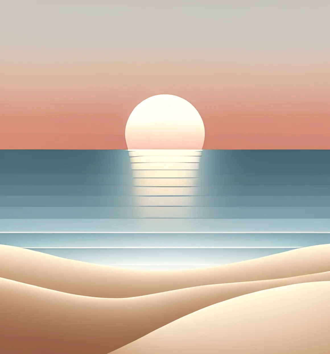Modern Sunset Coast is perfect for modern decor. Featuring a serene beach scene with soft pastels and minimalist geometric shapes capturing the sun setting over the horizon, this stylish and modern wall art piece will bring a tranquil feel to any space.