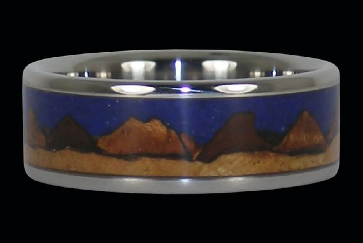 Titanium ring set with wood and stone mountain range. Choose your wood and stone for this design. Night and day scenes available. Intricate design for hikers and outdoorsy couples. Men and women’s unisex wedding bands or anniversary rings. We are here to help you customize.