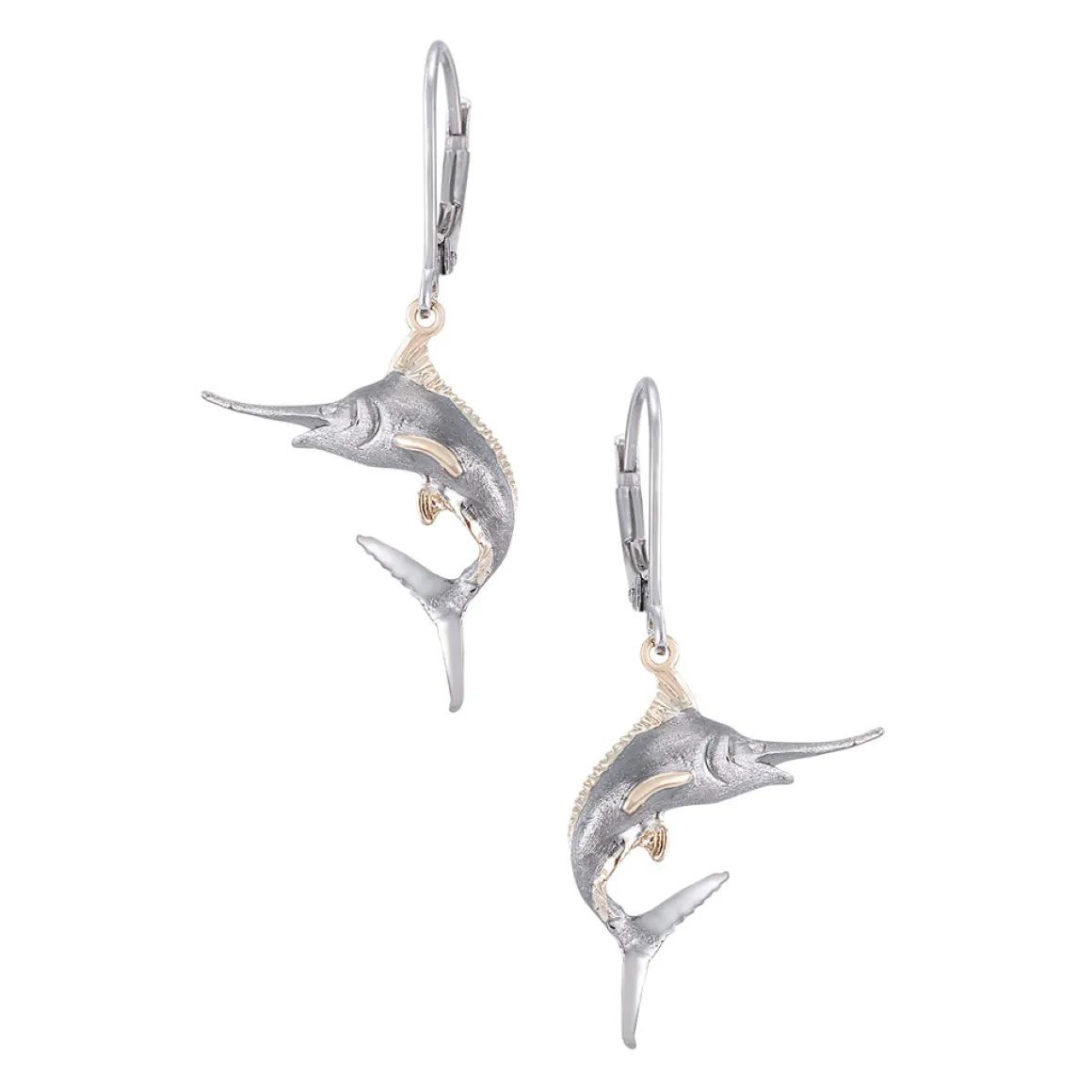 These blue marlin precious silver earrings are made from 14k yellow gold, featuring 4 diamonds with a dangle leverback.