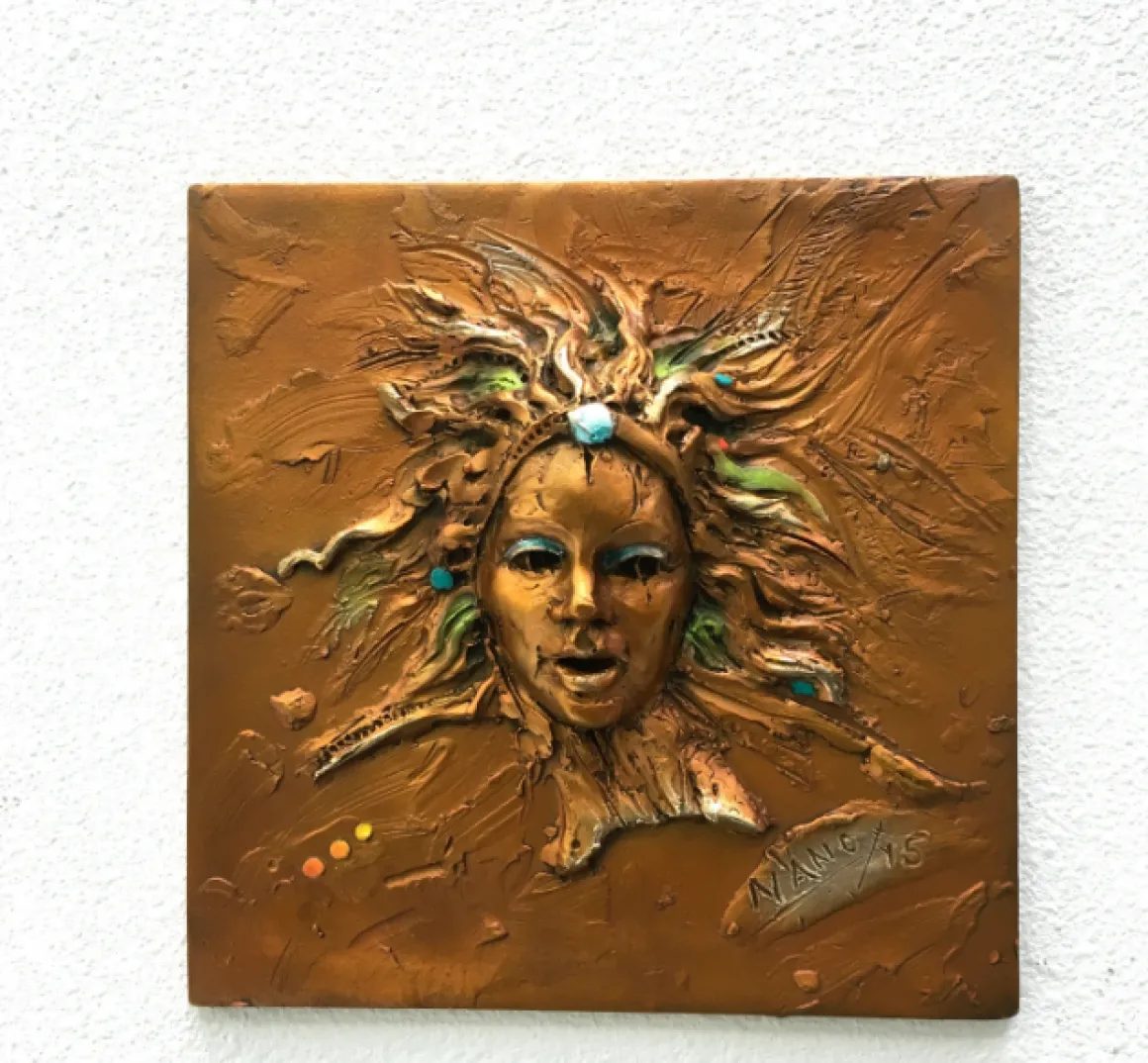 Renaissance is a captivating bronze relief that pays homage to classical beauty while bearing Nano Lopez’s unmistakable contemporary spirit. A serene female face emerges from the textured square panel, her features rendered with delicate precision—parted lips, contemplative eyes, and a noble countenance. Her hair flows dramatically outward in all directions like rays of sunlight or wind-swept flames, creating dynamic movement across the composition. Accents of turquoise and verdant green dance through the golden bronze tresses, while a luminous turquoise jewel crowns her forehead. The textured background adds depth and artistic energy, signed with the artist’s distinctive mark. This wall-mounted piece brings classical elegance with a modern twist to any space.