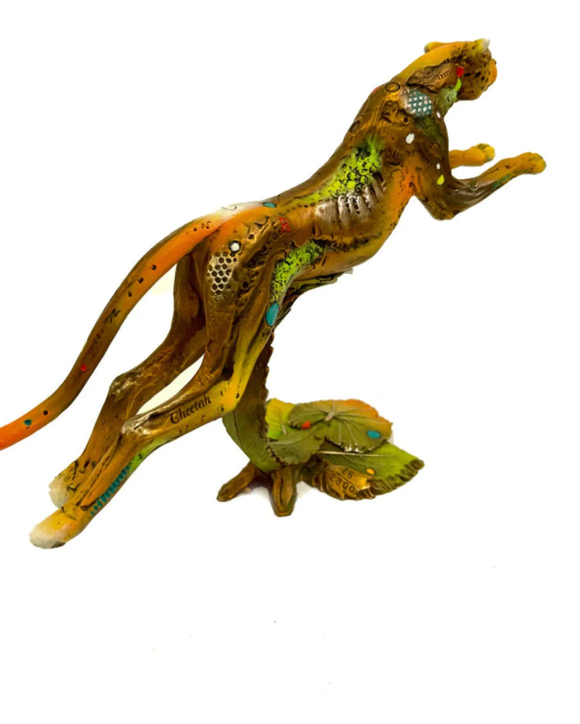 Sarah AP is an Artist’s Proof edition capturing a cheetah at the peak of her stride—muscles tensed, paws extended, embodying pure velocity and grace. This dynamic bronze captures the world’s fastest land animal in mid-leap, her sleek form adorned with Nano Lopez’s signature decorative touches: golden amber and warm bronze tones blend with splashes of vibrant orange on her distinctive spotted tail, lime green accents, and turquoise highlights. The word “Cheetah” is inscribed along her flank, while textured patterns suggest both the cat’s natural markings and artistic embellishment. She launches from a naturalistic base decorated with leaves. As an Artist’s Proof, this piece represents a specially designated edition outside the numbered series—a collector’s treasure.