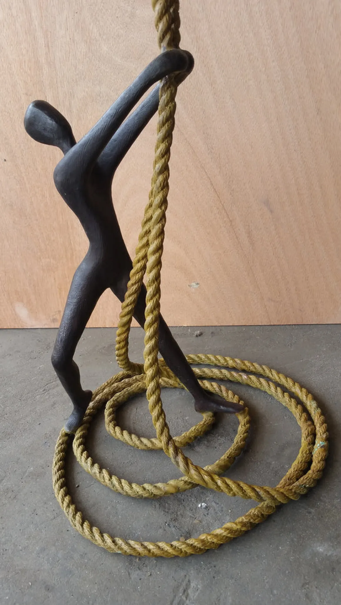 The sculpture creates a stunning vertical composition, with the dark bronze figures contrasting beautifully against the warm golden rope that coils elegantly at the base. It speaks to dreamers, risk-takers, and anyone who has ever been supported by someone who believed in them enough to let them fly.