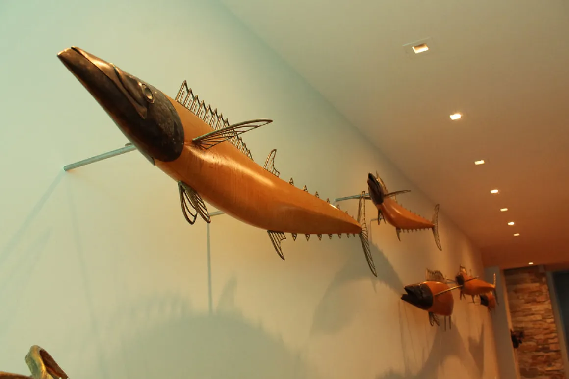 This piece captures the streamlined power and elegance of wahoo, which are among the fastest fish in the ocean. The bodies are carved of curly maple, which naturally has a tiger-striped patterning similar to that of a wahoo. The maple was bent to create the flowing curves that these fish demonstrate when swimming. The head is hammered and welded out of bronze with saw blades for teeth and polished stainless steel eyes. The fins are welded out of bronze rod.