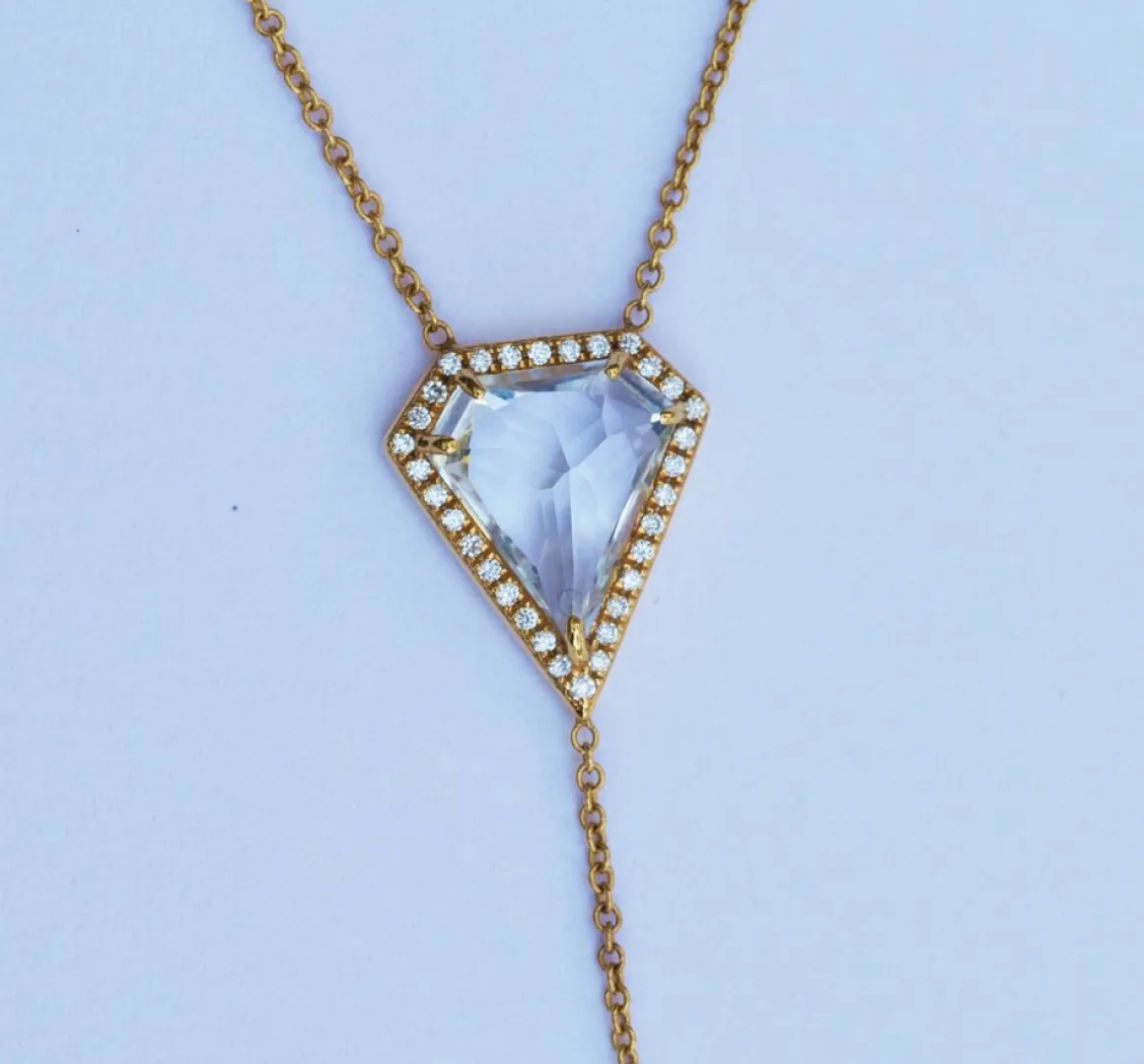 Specialty cut (Kite) White Topaz surrounded by pavé diamonds. Bezel set Diamond Drop.